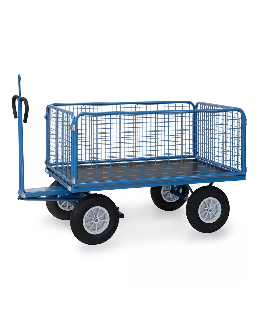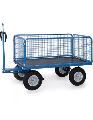 Ensemble mécano-soudé, revêtement époxy bleu RAL 5007. 4 inserts dans les angles, essieu sur rond à billes, timon en triangle avec poignée avec revêtement en plastique sécurisée remontant automatiquement en position verticale. Avec oeillet de traction, Ø interne 32 mm. Plateau en contreplaqué avec revêtement antidérapant et hydrofuge. 4 ridelles de 600 mm de haut boulonnées à la plateforme, grands côtés amovibles. Treillis métallique mécano-soudé, maille de 40 x 40 x 4 mm. Roues en mousse polyuréthane increvables, moyeu à roulement à rouleaux. Freinage automatique sur essieu avant.