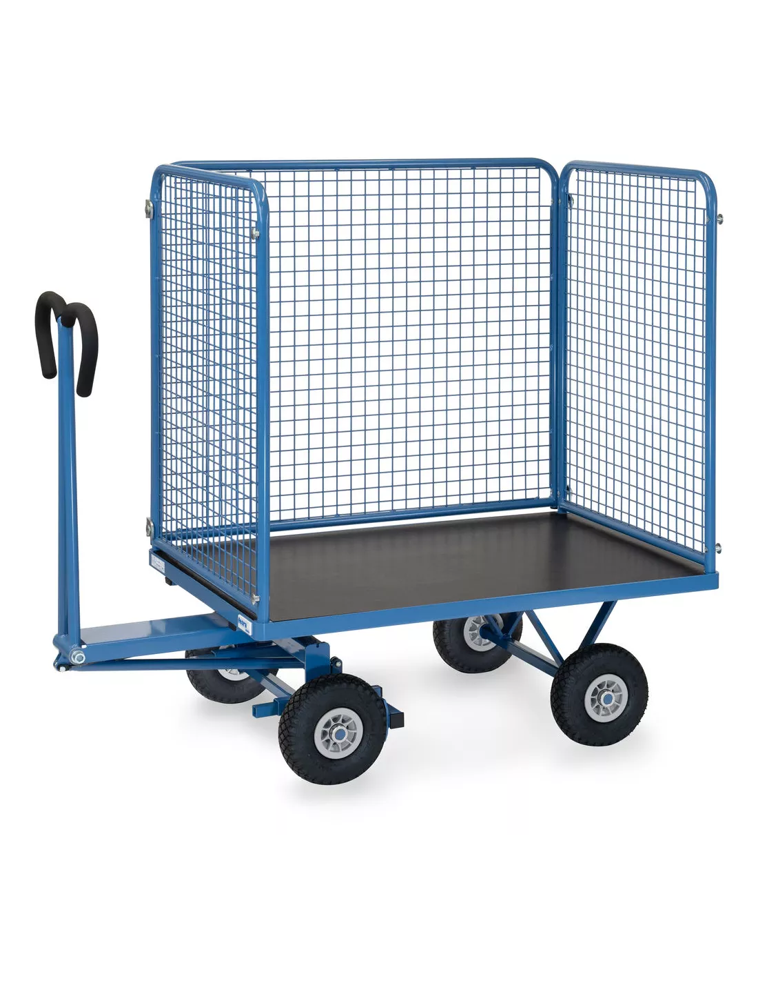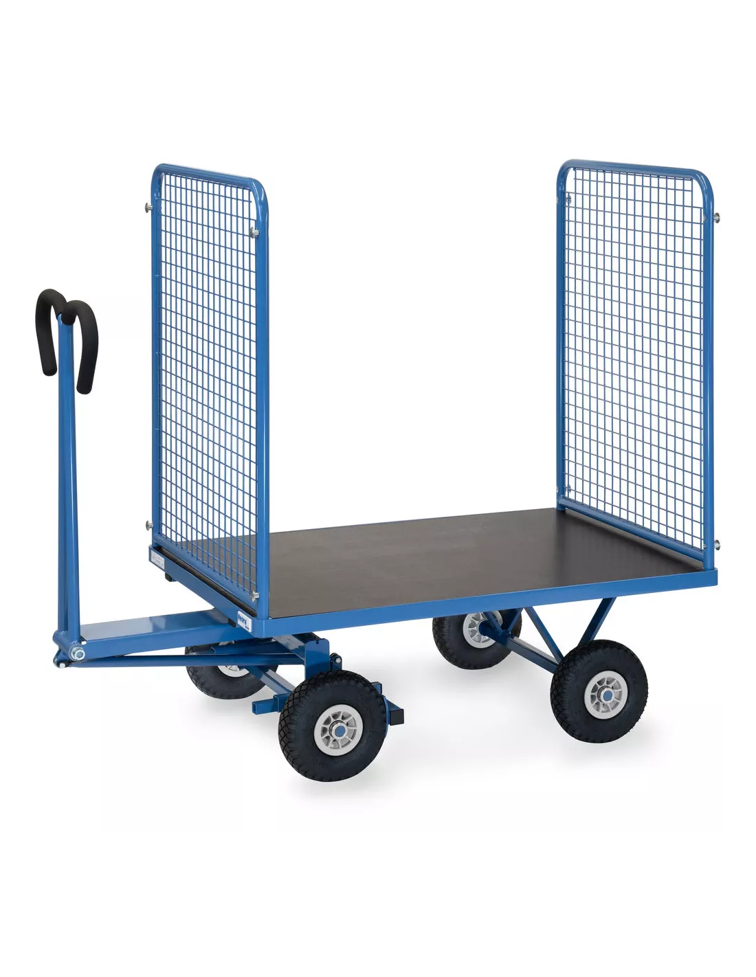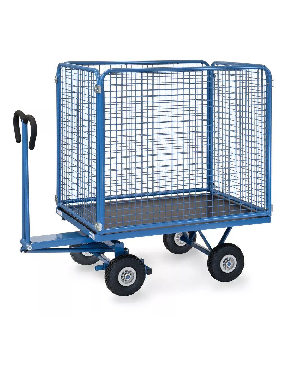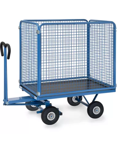 Ensemble mécano-soudé, revêtement époxy bleu RAL 5007. 4 inserts dans les angles, essieu sur rond à billes, timon en triangle avec poignée avec revêtement en plastique sécurisée remontant automatiquement en position verticale. Plateau en contreplaqué avec revêtement antidérapant et hydrofuge. 4 ridelles de 1000 mm de haut boulonnées à la plateforme, grands côtés amovibles. Treillis métallique mécano-soudé, maille de 40 x 40 x 4 mm. Roues en mousse polyuréthane increvables, moyeu à roulement à rouleaux. Freinage automatique sur essieu avant.