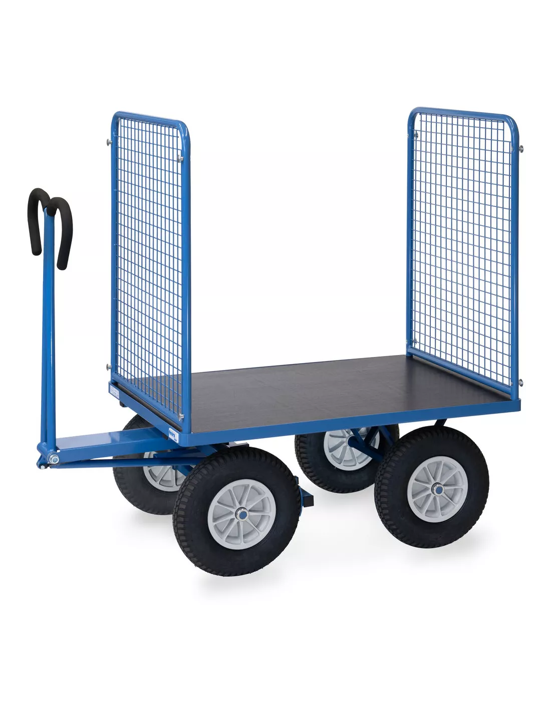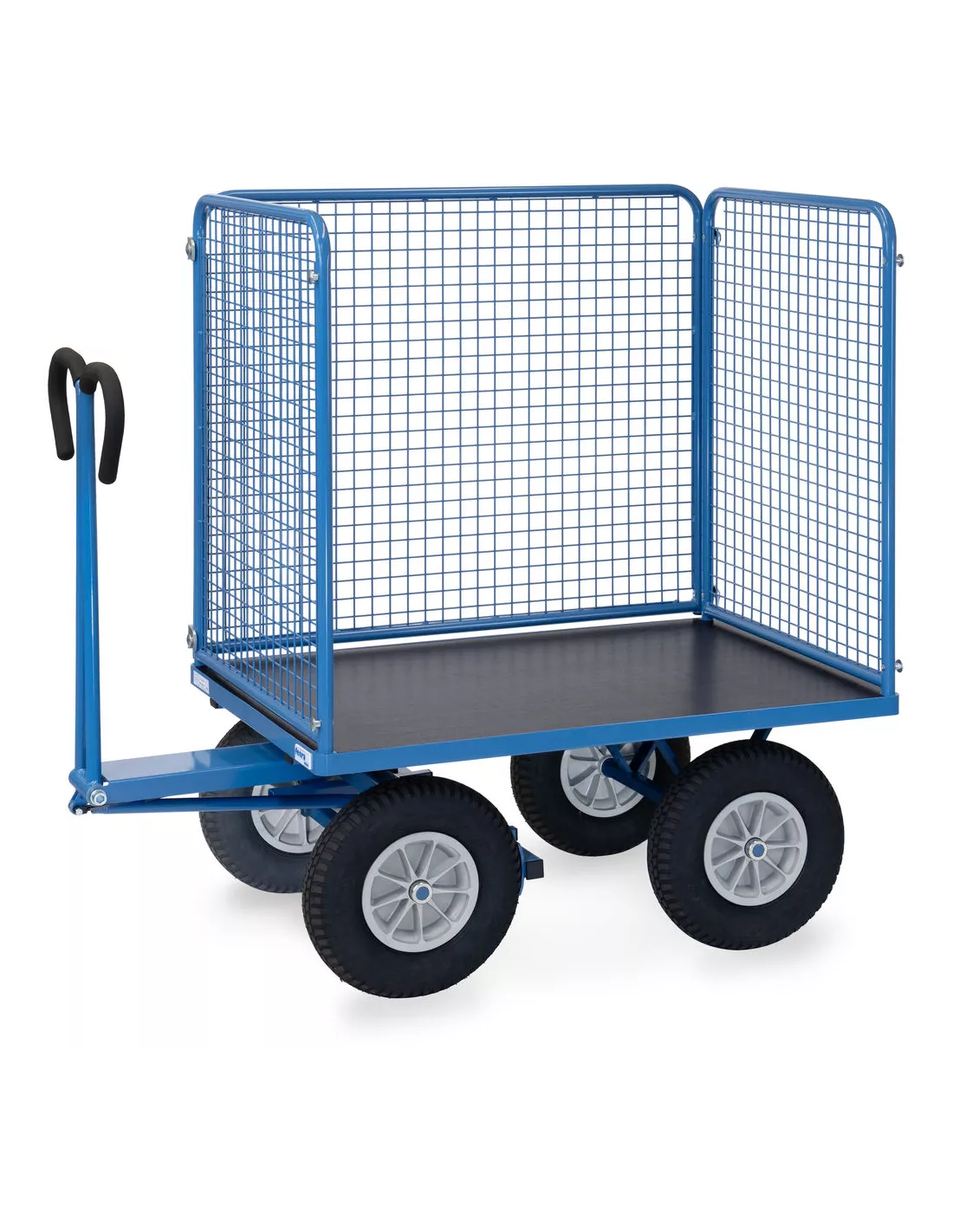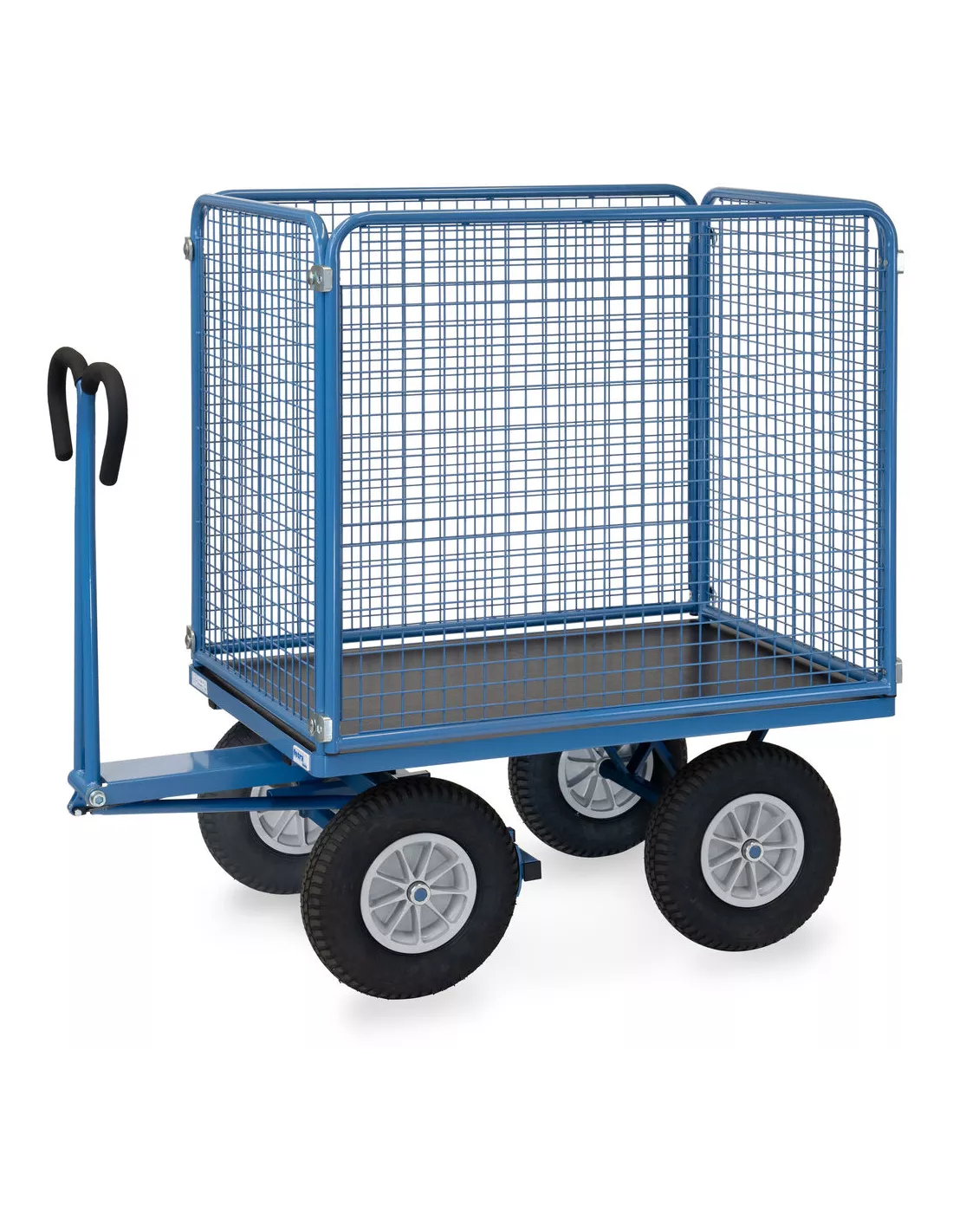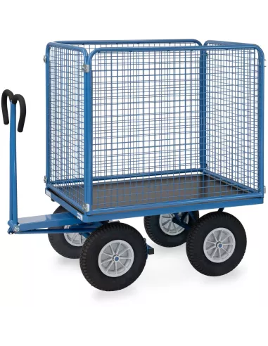 Ensemble mécano-soudé, revêtement époxy bleu RAL 5007. 4 inserts dans les angles, essieu sur rond à billes, timon en triangle avec poignée avec revêtement en plastique sécurisée remontant automatiquement en position verticale. Plateau en contreplaqué avec revêtement antidérapant et hydrofuge. 4 ridelles de 1000 mm de haut boulonnées à la plateforme, grands côtés amovibles. Treillis métallique mécano-soudé, maille de 40 x 40 x 4 mm. Roues en mousse polyuréthane increvables, moyeu à roulement à rouleaux. Freinage automatique sur essieu avant.