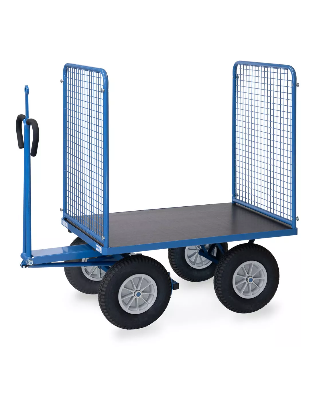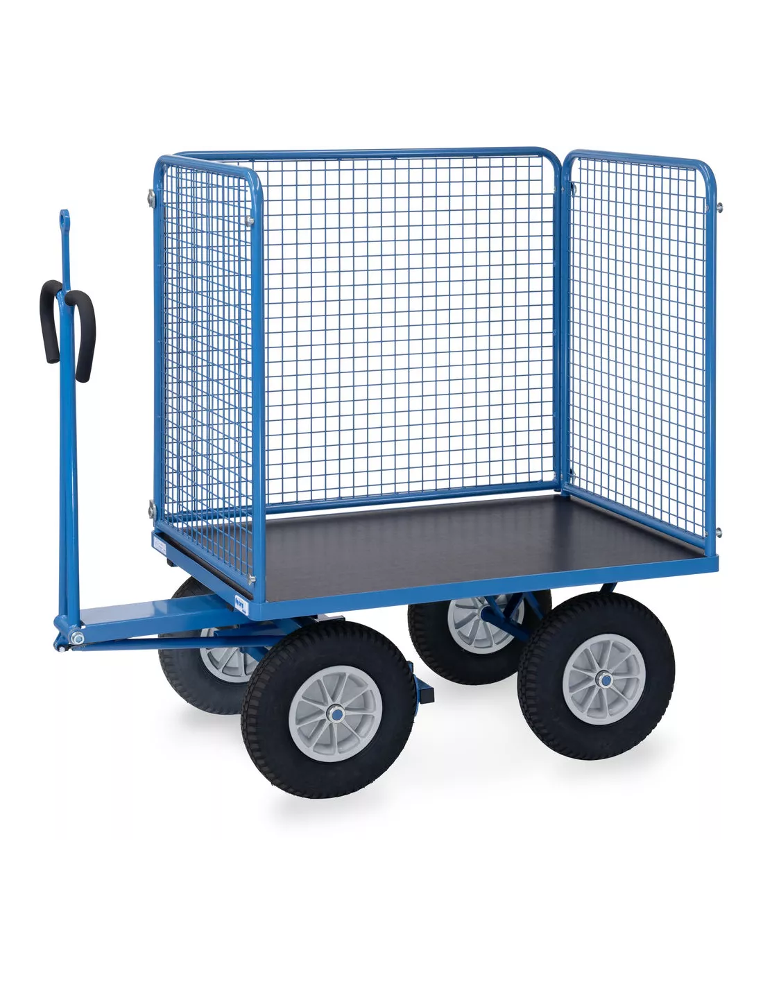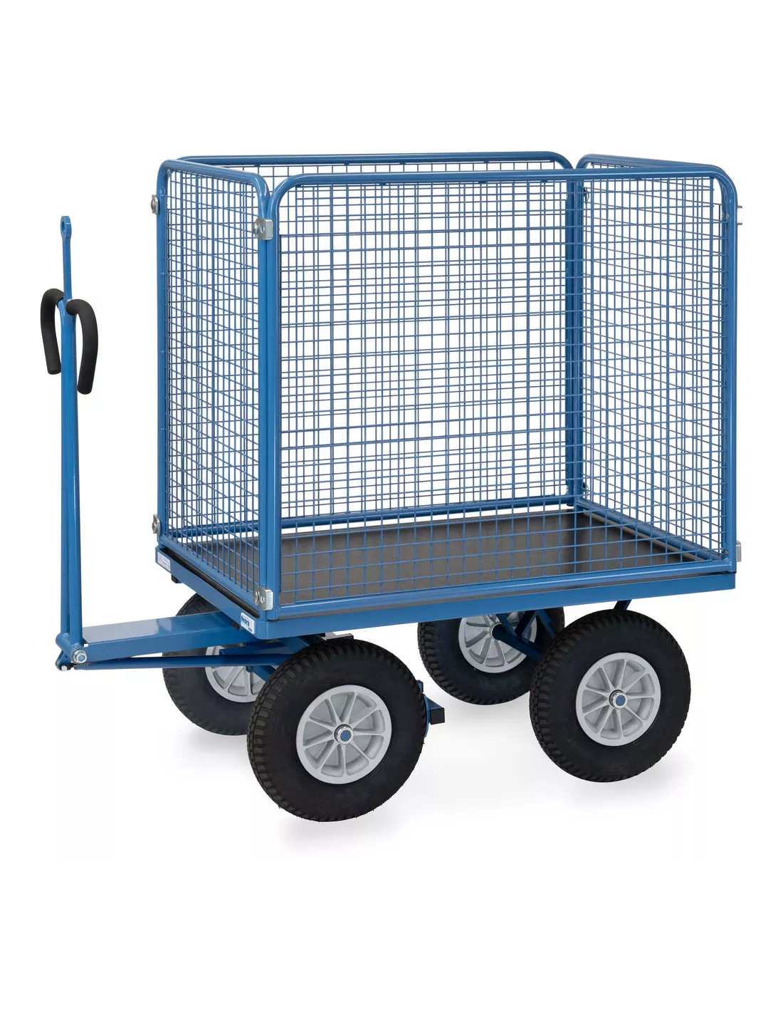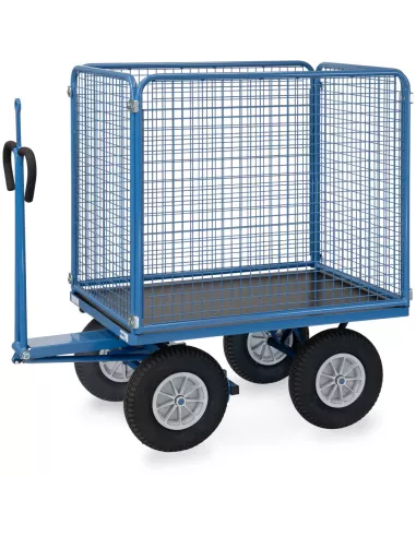 Ensemble mécano-soudé, revêtement époxy bleu RAL 5007. 4 inserts dans les angles, essieu sur rond à billes, timon en triangle avec poignée avec revêtement en plastique sécurisée remontant automatiquement en position verticale. Avec oeillet de traction, Ø interne 32 mm. Plateau en contreplaqué avec revêtement antidérapant et hydrofuge. 4 ridelles de 1000 mm de haut boulonnées à la plateforme, grands côtés amovibles. Treillis métallique mécano-soudé, maille de 40 x 40 x 4 mm. Roues en mousse polyuréthane increvables, moyeu à roulement à rouleaux. Freinage automatique sur essieu avant.