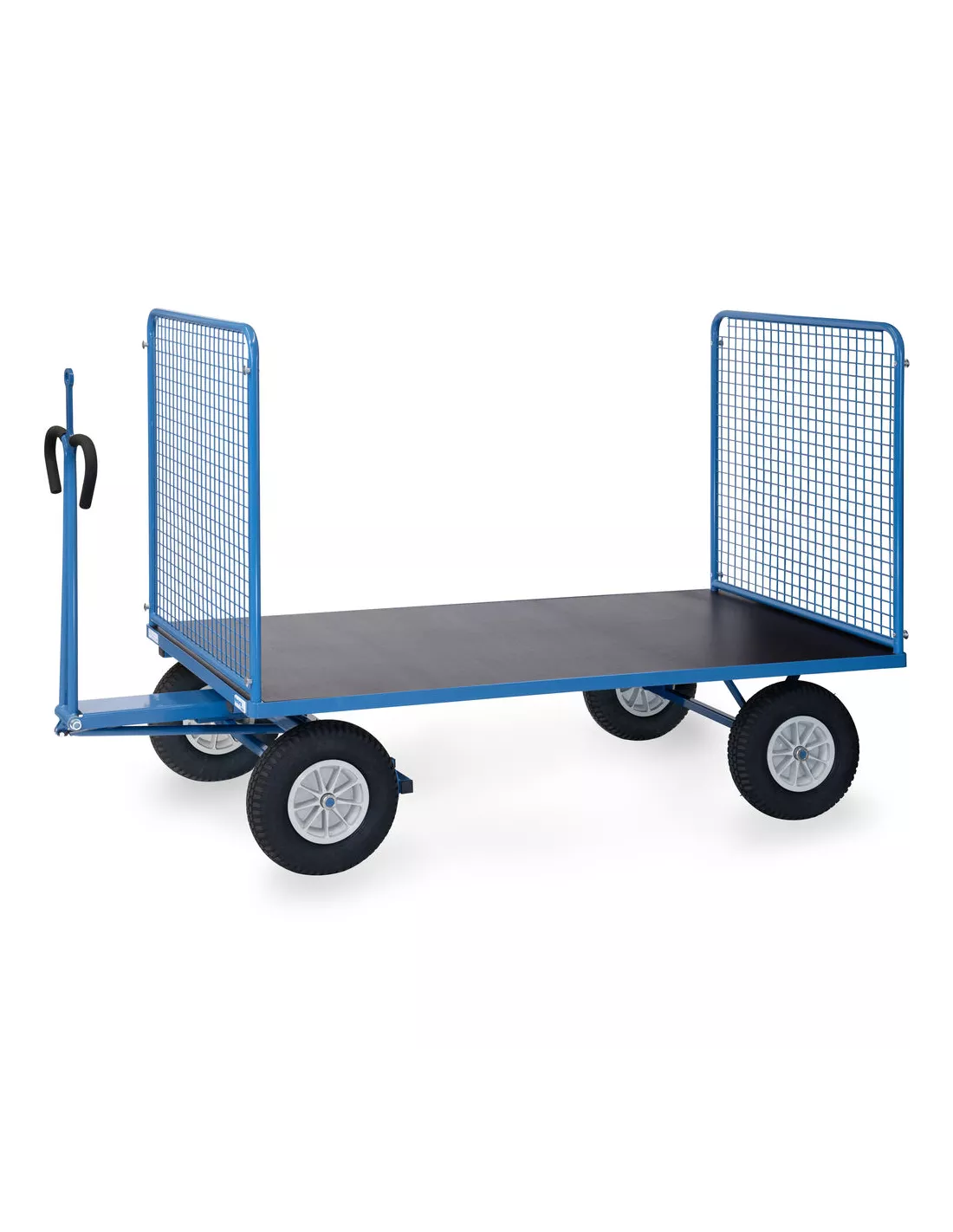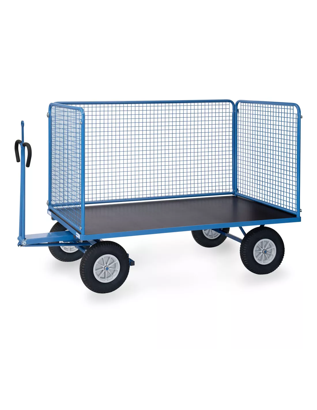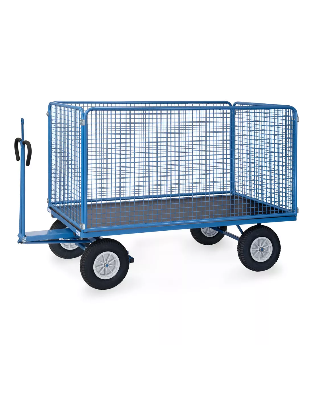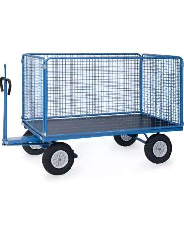 Ensemble mécano-soudé, revêtement époxy bleu RAL 5007. 4 inserts dans les angles, essieu sur rond à billes, timon en triangle avec poignée avec revêtement en plastique sécurisée remontant automatiquement en position verticale. Avec oeillet de traction, Ø interne 32 mm. Plateau en contreplaqué avec revêtement antidérapant et hydrofuge. 4 ridelles de 1000 mm de haut boulonnées à la plateforme, grands côtés amovibles. Treillis métallique mécano-soudé, maille de 40 x 40 x 4 mm. Roues en mousse polyuréthane increvables, moyeu à roulement à rouleaux. Freinage automatique sur essieu avant.