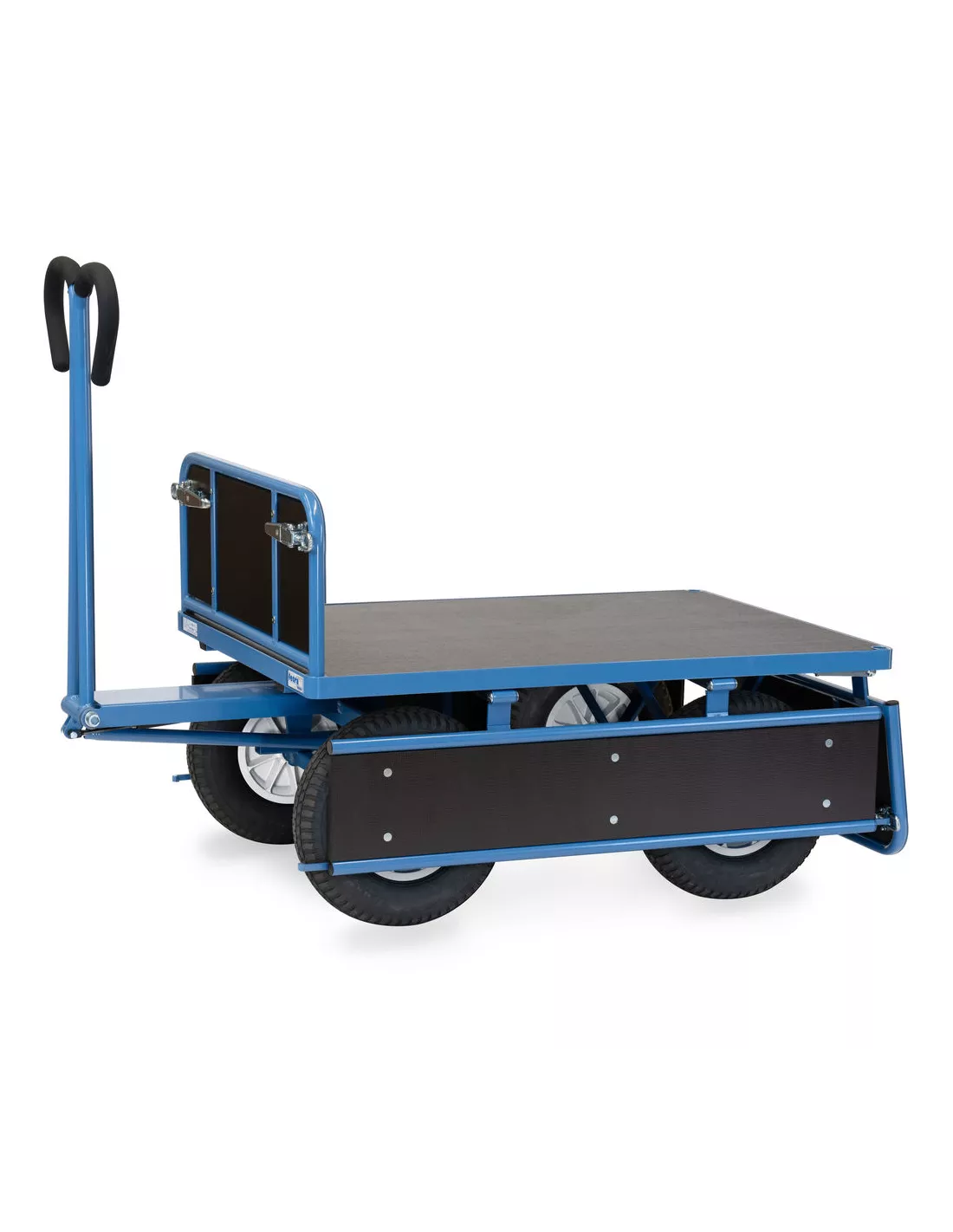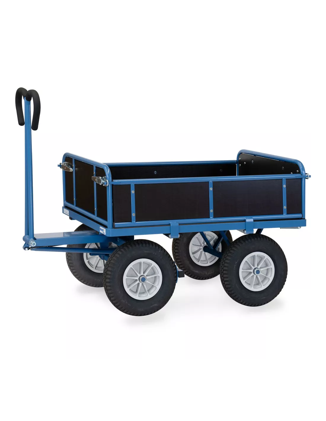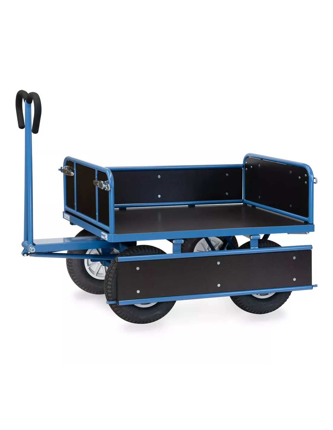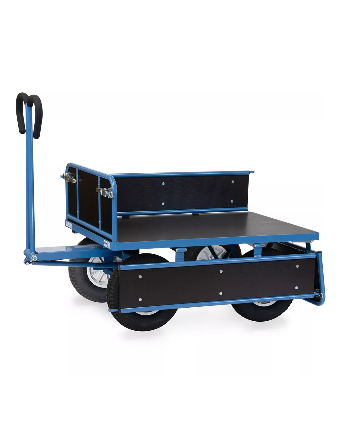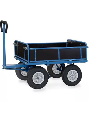 Ensemble mécano-soudé, revêtement époxy bleu RAL 5007. 4 inserts dans les angles, essieu sur rond à billes, timon en triangle avec poingée avec revêtement en plastique sécurisée remontant automatiquement en position verticale. Plateau en contreplaqué avec revêtement antidérapant et hydrofuge. 4 ridelles bois traité hydrofuge 250/325mm dont 3 côtés amovibles. Roues en mousse polyuréthane increvables, moyeu à roulement à rouleaux. Freinage automatique sur essieu avant.