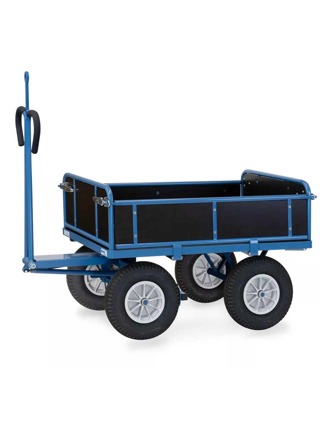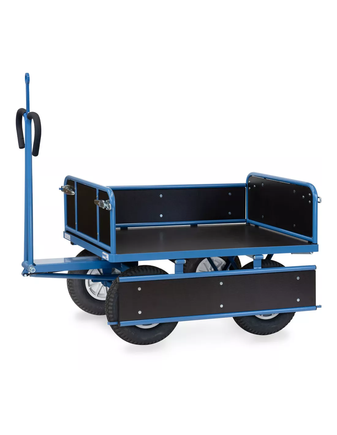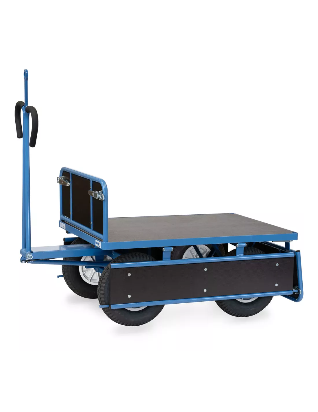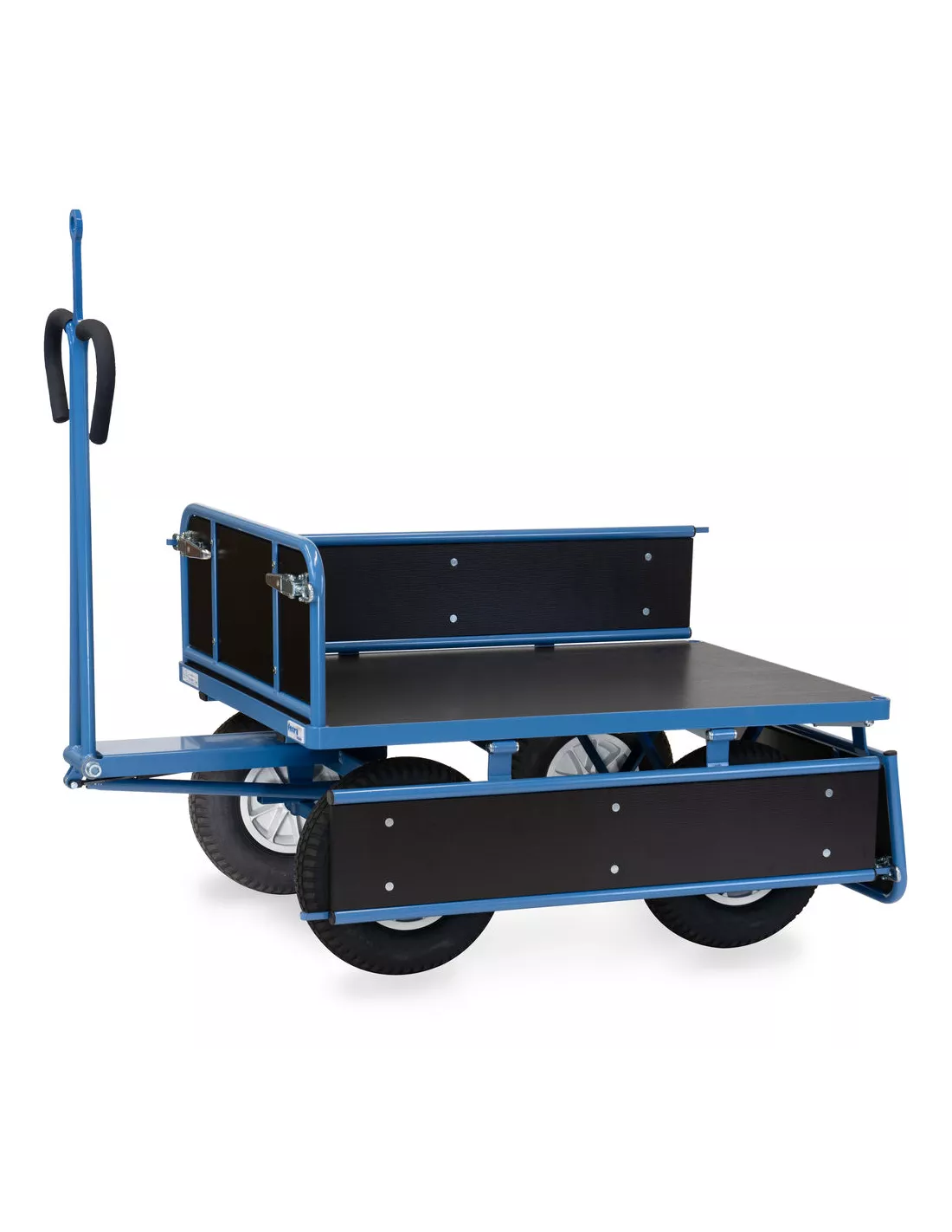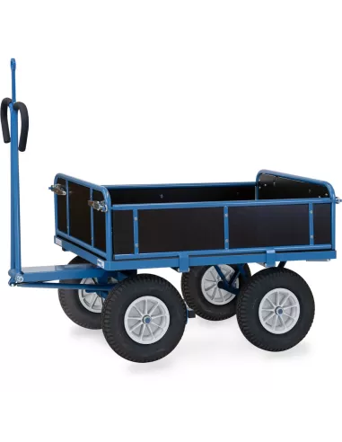 Ensemble mécano-soudé, revêtement époxy bleu RAL 5007. 4 inserts dans les angles, essieu sur rond à billes, timon en triangle avec poignée avec revêtement en plastique sécurisée remontant automatiquement en position verticale. Avec oeillet de traction, Ø interne 32 mm. Plateau en contreplaqué avec revêtement antidérapant et hydrofuge. Roues en mousse polyuréthane increvables, moyeu à roulement à rouleaux. Freinage automatique sur essieu avant.