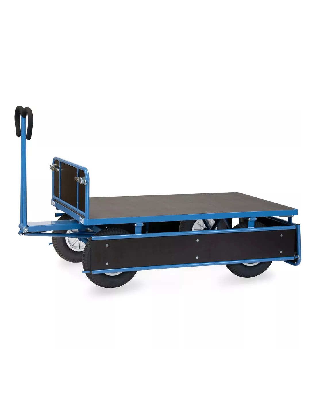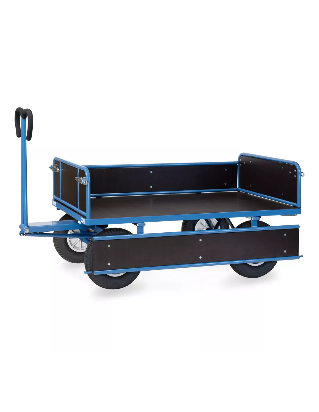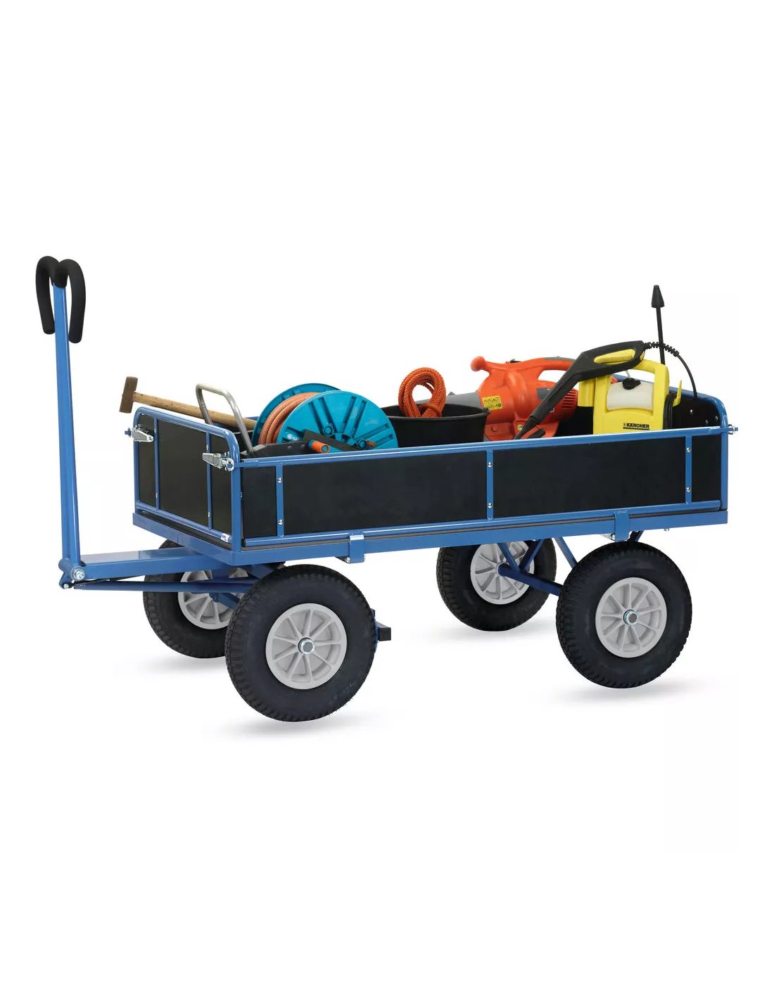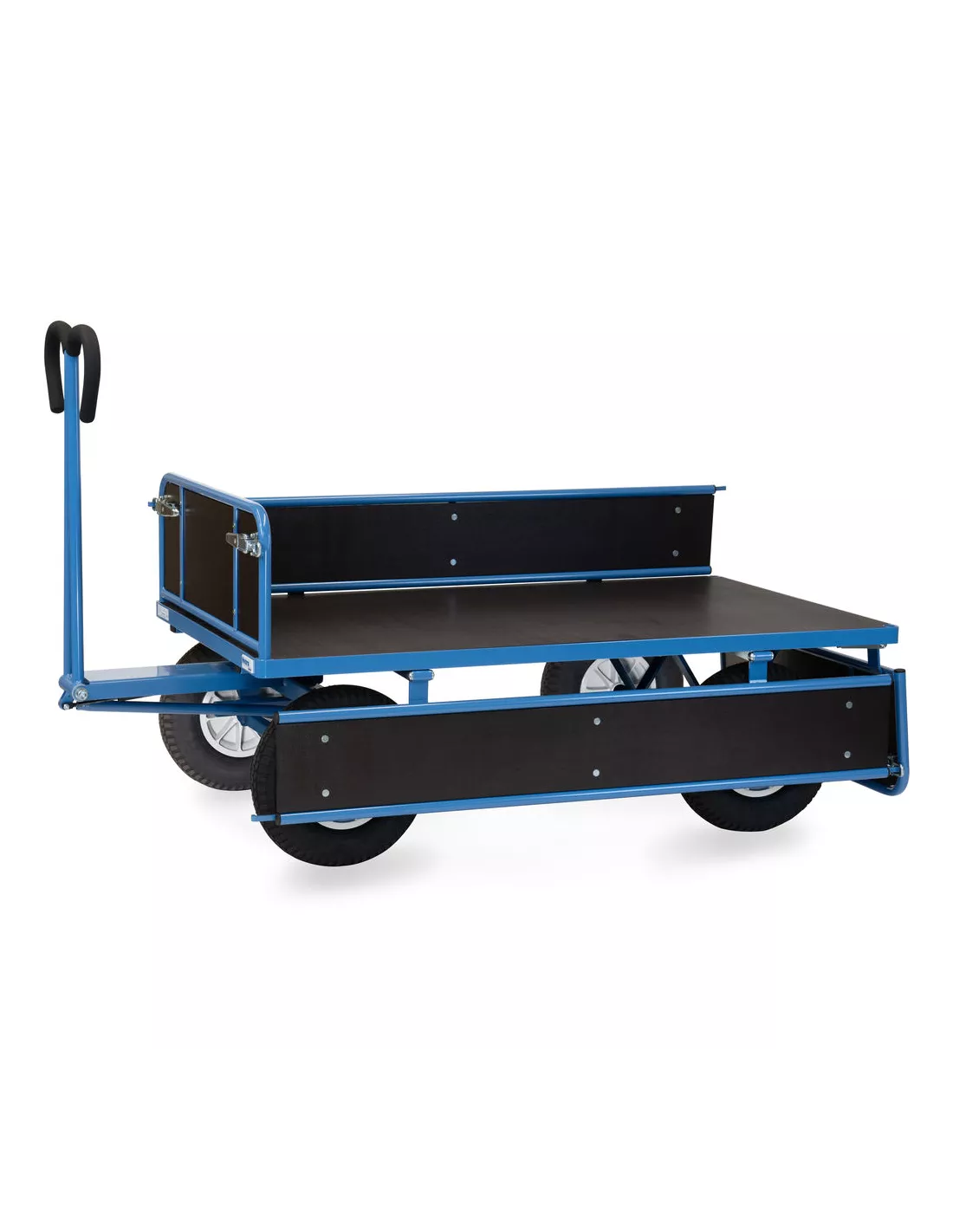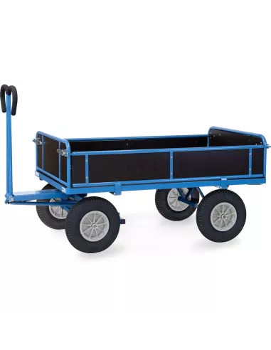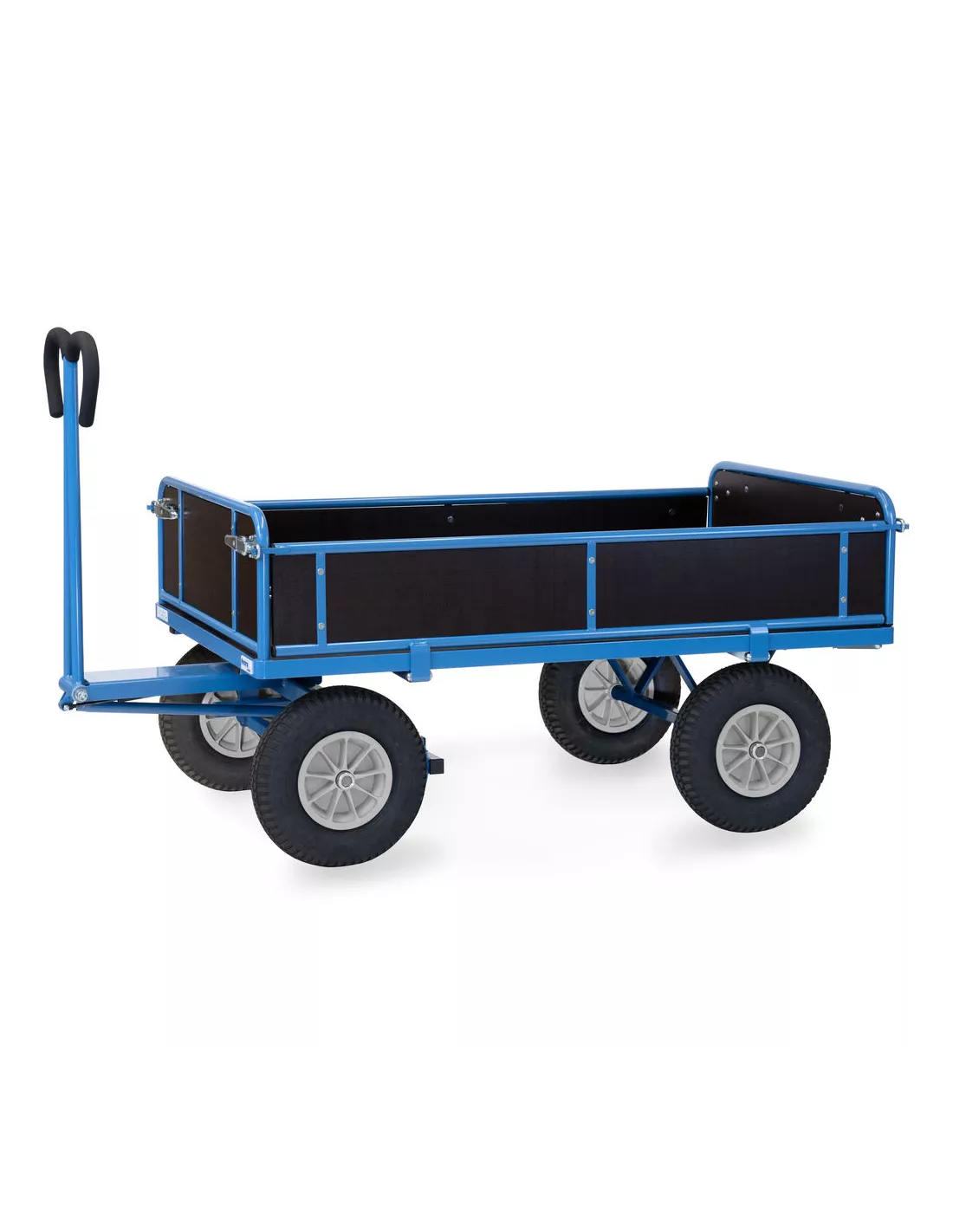 Ensemble mécano-soudé, revêtement époxy bleu RAL 5007. 4 inserts dans les angles, essieu sur rond à billes, timon en triangle avec poignée avec revêtement en plastique sécurisée remontant automatiquement en position verticale. Plateau en contreplaqué avec revêtement antidérapant et hydrofuge. 4 ridelles bois traité hydrofuge 250/325mm dont 3 côtés amovibles. Roues en mousse polyuréthane increvables, moyeu à roulement à rouleaux. Freinage automatique sur essieu avant.