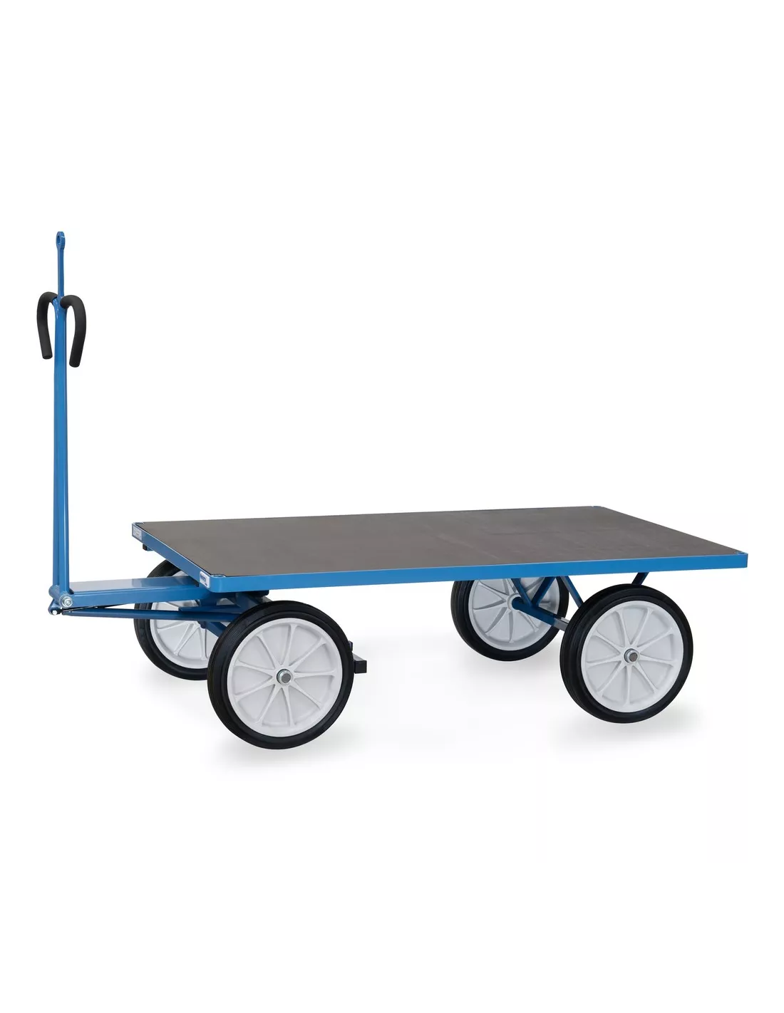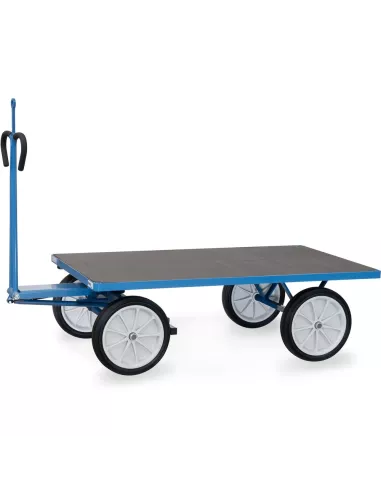Ensemble mécano-soudé, revêtement époxy bleu RAL 5007. 4 inserts dans les angles, essieu sur rond à billes, timon en triangle avec poignée avec revêtement en plastique sécurisée remontant automatiquement en position verticale. Avec oeillet de traction, Ø interne 32 mm. Plateau en contreplaqué avec revêtement antidérapant et hydrofuge. Roues à bandage caoutchouc, moyeu à roulement à rouleaux. Freinage automatique sur essieu avant.