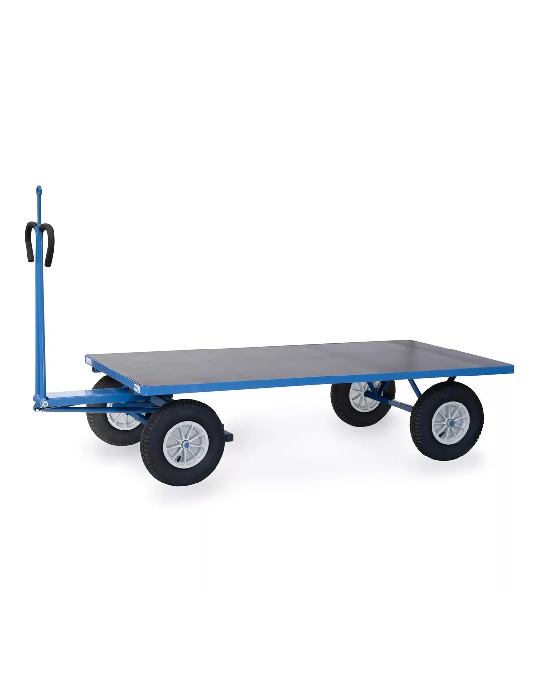 Ensemble mécano-soudé, revêtement époxy bleu RAL 5007. 4 inserts dans les angles, essieu sur rond à billes, timon en triangle avec poignée avec revêtement en plastique sécurisée remontant automatiquement en position verticale. Avec oeillet de traction, Ø interne 32 mm. Plateau en contreplaqué avec revêtement antidérapant et hydrofuge. Roues gonflables, moyeu à roulement à rouleaux. Freinage automatique sur essieu avant.