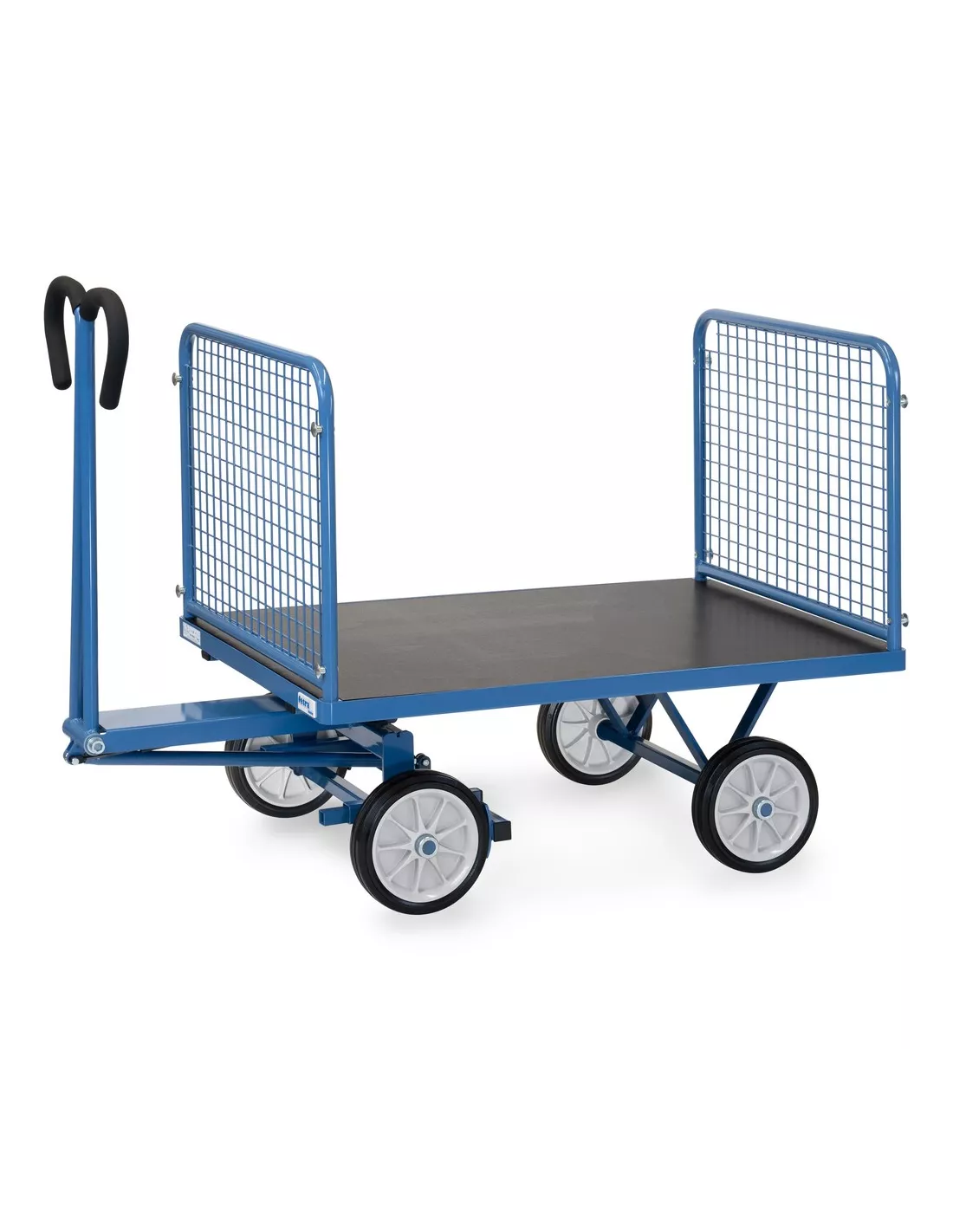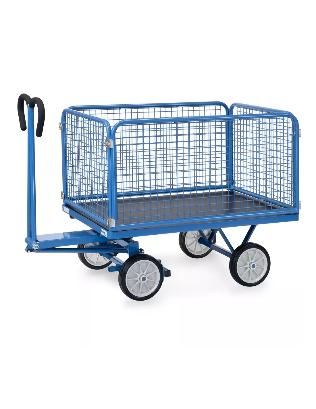 Ensemble mécano-soudé, revêtement époxy bleu RAL 5007. 4 inserts dans les angles, essieu sur rond à billes, timon en triangle avec poignée avec revêtement en plastique sécurisée remontant automatiquement en position verticale. Plateau en contreplaqué avec revêtement antidérapant et hydrofuge. 4 ridelles de 600 mm de haut boulonnées à la plateforme, grands côtés amovibles. Treillis métallique mécano-soudé, maille de 40 x 40 x 4 mm. Roues à bandage caoutchouc, moyeu à roulement à rouleaux. Freinage automatique sur essieu avant.