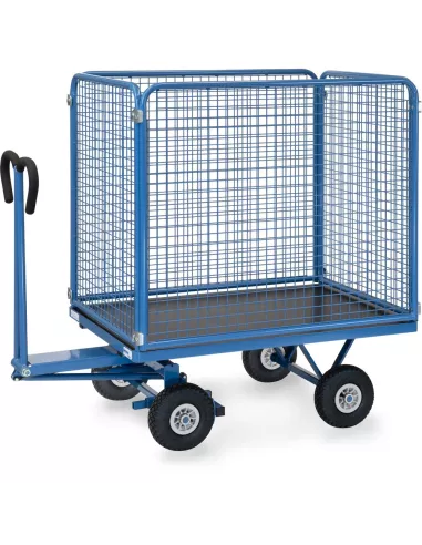 Ensemble mécano-soudé, revêtement époxy bleu RAL 5007. 4 inserts dans les angles, essieu sur rond à billes, timon en triangle avec poignée avec revêtement en plastique sécurisée remontant automatiquement en position verticale. Plateau en contreplaqué avec revêtement antidérapant et hydrofuge. 4 ridelles de 1000 mm de haut boulonnées à la plateforme, grands côtés amovibles. Treillis métallique mécano-soudé, maille de 40 x 40 x 4 mm. Roues gonflables, moyeu à roulement à rouleaux. Freinage automatique sur essieu avant.