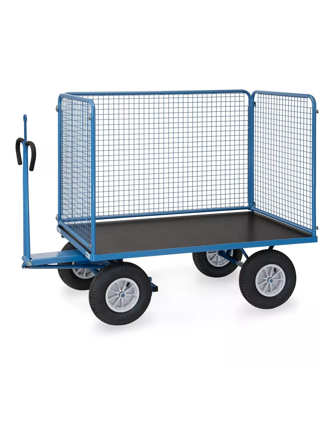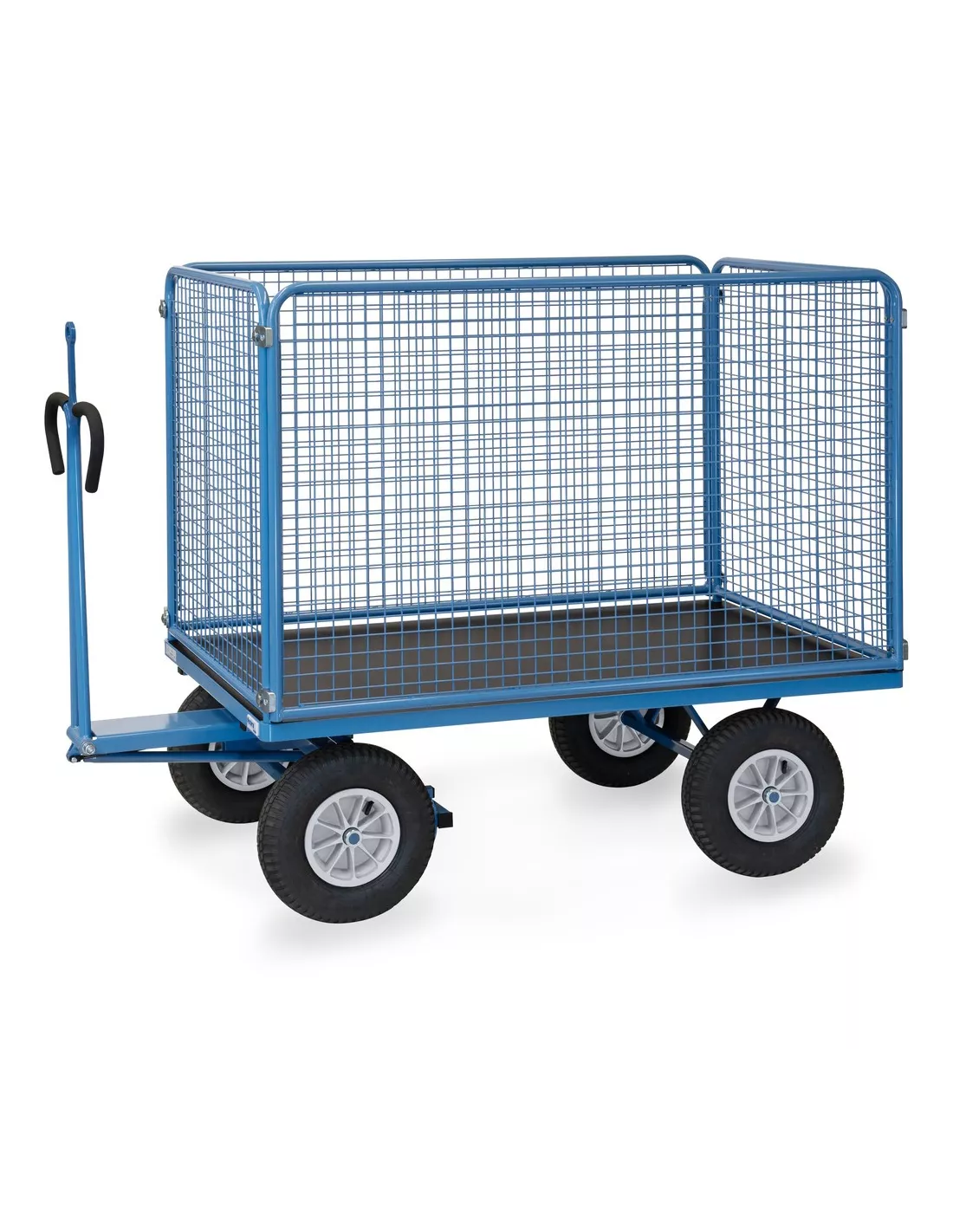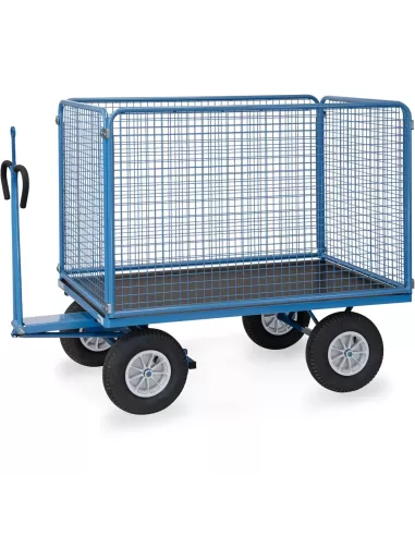 Ensemble mécano-soudé, revêtement époxy bleu RAL 5007. 4 inserts dans les angles, essieu sur rond à billes, timon en triangle avec poignée avec revêtement en plastique sécurisée remontant automatiquement en position verticale. Avec oeillet de traction, Ø interne 32 mm. Plateau en contreplaqué avec revêtement antidérapant et hydrofuge. 4 ridelles de 1000 mm de haut boulonnées à la plateforme, grands côtés amovibles. Treillis métallique mécano-soudé, maille de 40 x 40 x 4 mm. Roues gonflables, moyeu à roulement à rouleaux. Freinage automatique sur essieu avant.