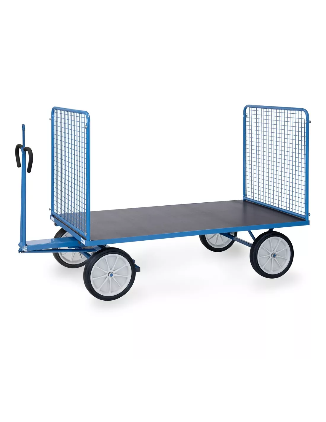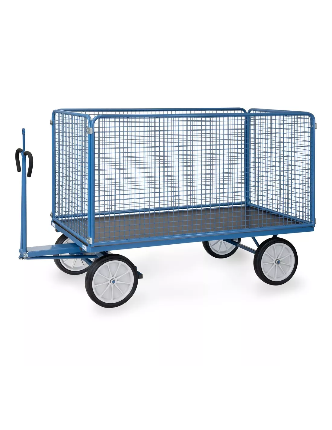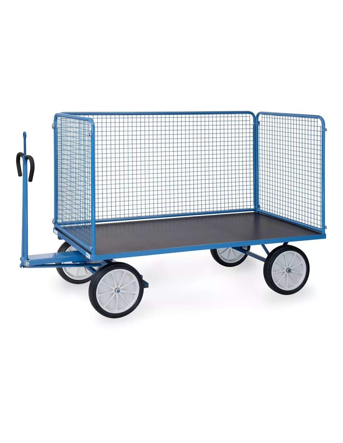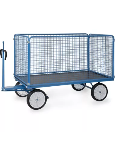 Ensemble mécano-soudé, revêtement époxy bleu RAL 5007. 4 inserts dans les angles, essieu sur rond à billes, timon en triangle avec poignée avec revêtement en plastique sécurisée remontant automatiquement en position verticale. Avec oeillet de traction, Ø interne 32 mm. Plateau en contreplaqué avec revêtement antidérapant et hydrofuge. 4 ridelles de 1000 mm de haut boulonnées à la plateforme, grands côtés amovibles. Treillis métallique mécano-soudé, maille de 40 x 40 x 4 mm. Roues à bandage caoutchouc, moyeu à roulement à rouleaux. Freinage automatique sur essieu avant.