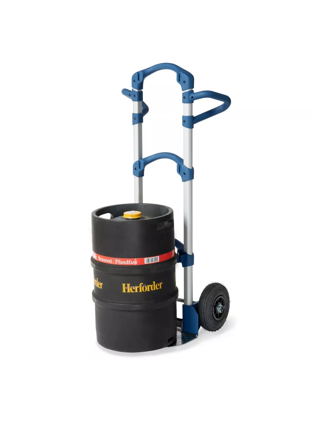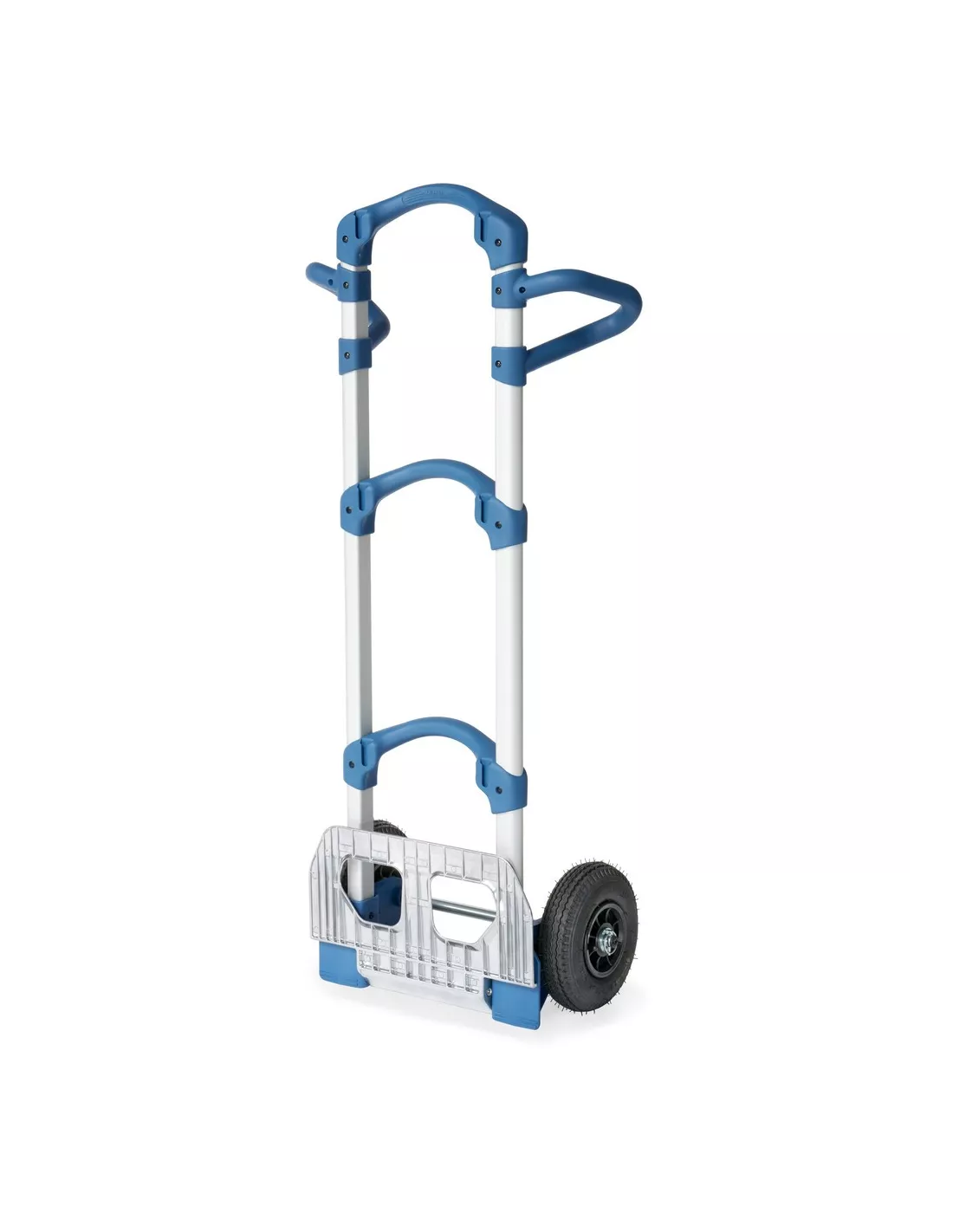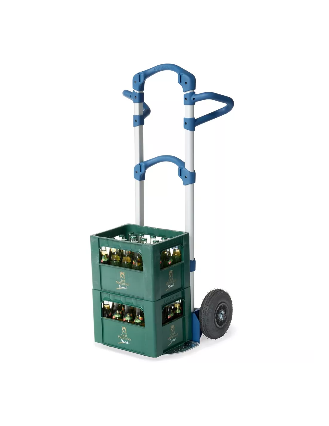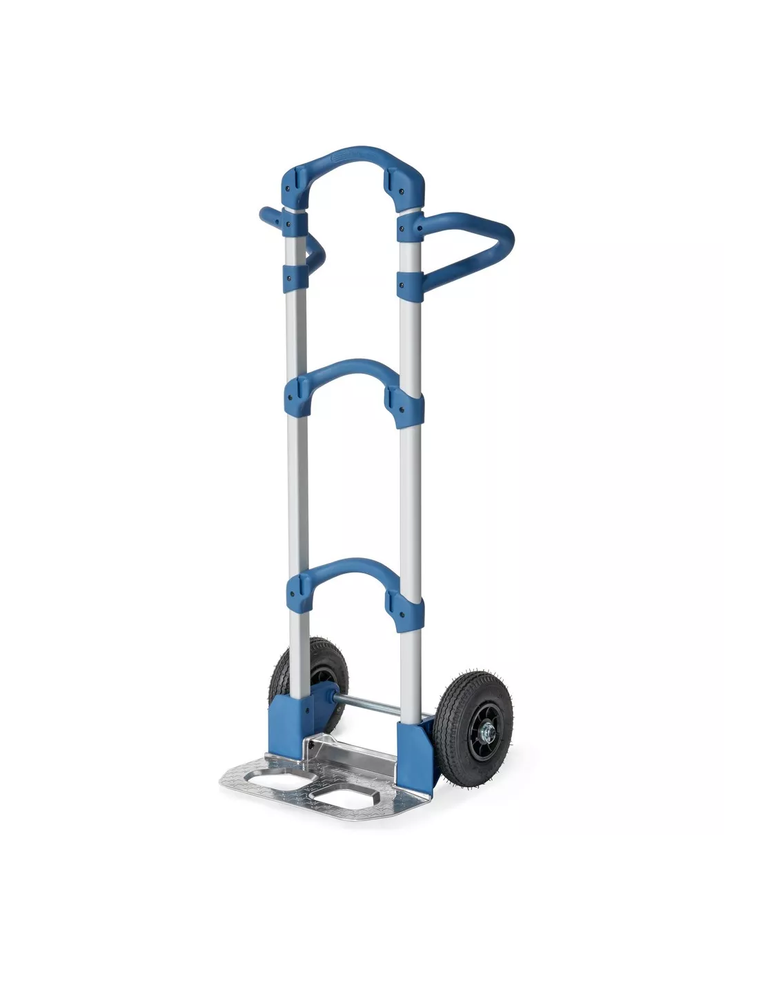 Le diable alu compact „Wuppi“ est un diable universel très pratique avec bavette rabattable. Les poignées ergonomiques permettent une prise en main à une hauteur appropriée répondant à tous types de déplacements, tout en protégeant l‘opérateur des risques de blessures aux mains. Le cintrage permet la prise en charge d‘éléments cylindriques. Sa construction en aluminium très robuste et soignée et dispose d'une bavette alu et de pièces plastiques de qualité. Le diable est équipé de roues gonflables très solides avec moyeu à roulements à billes facilement remplaçables. Poignées avec revêtement agréable au toucher. Configuration très compacte, mise en place de la bavette par simple pression du pied. Idéal pour une utilisation en déplacement comme par exemple pour des livraisons. Livré démonté, montage facile.