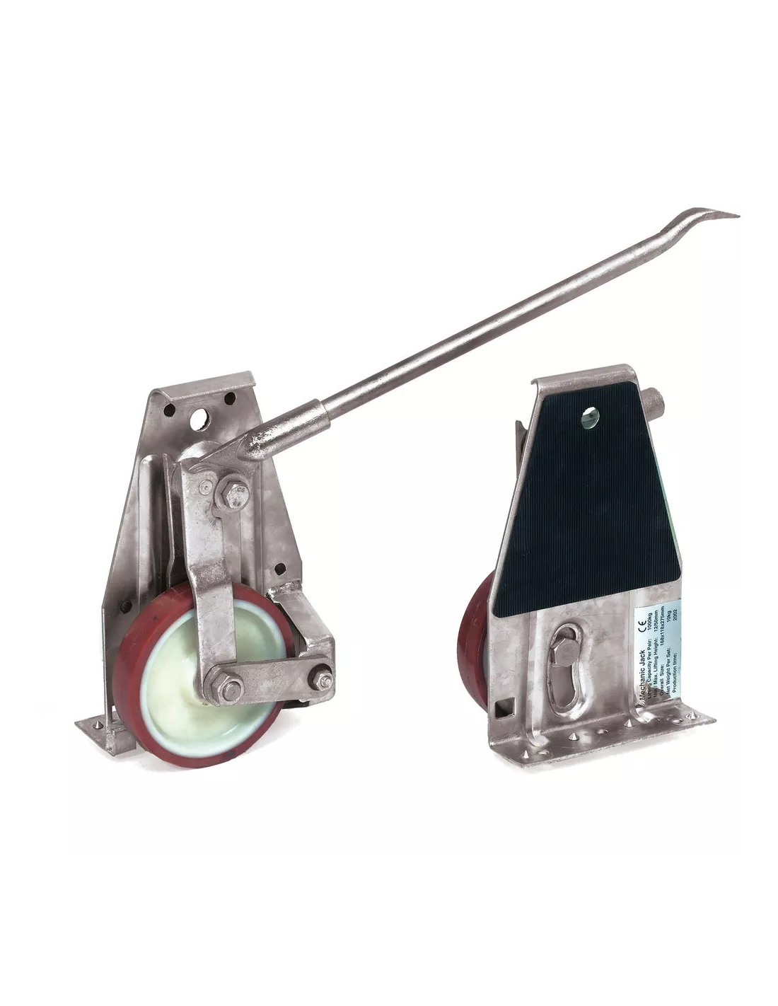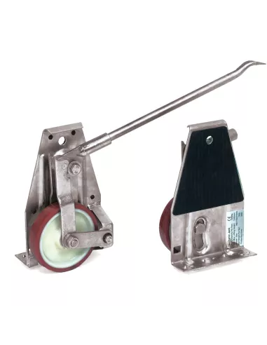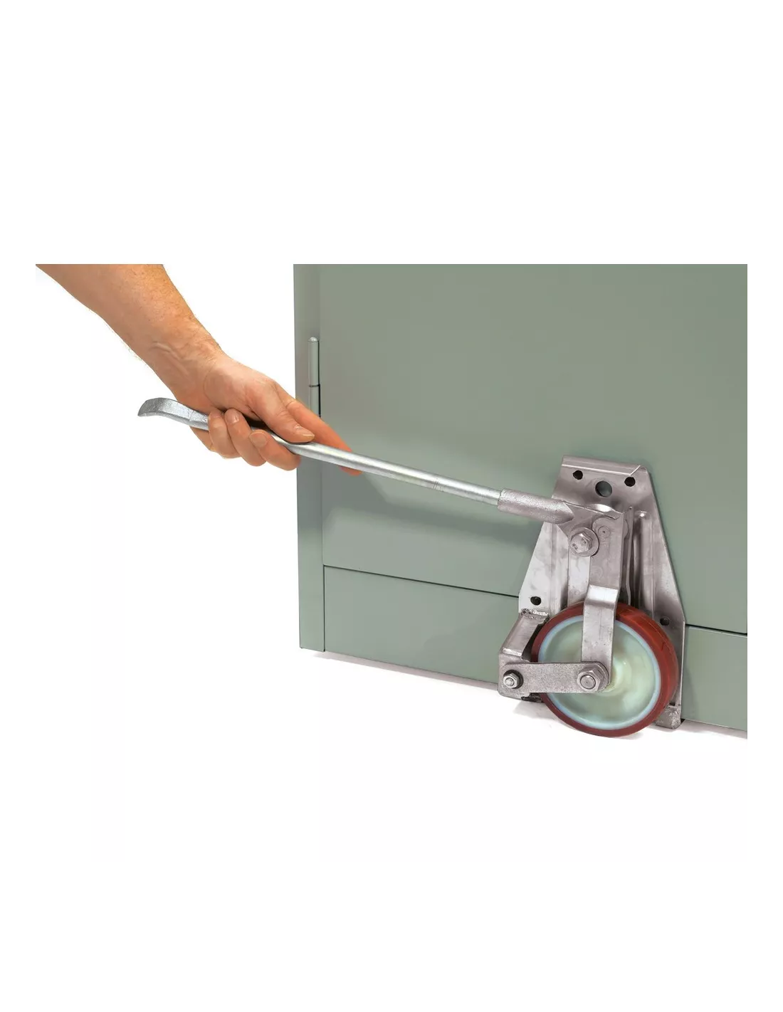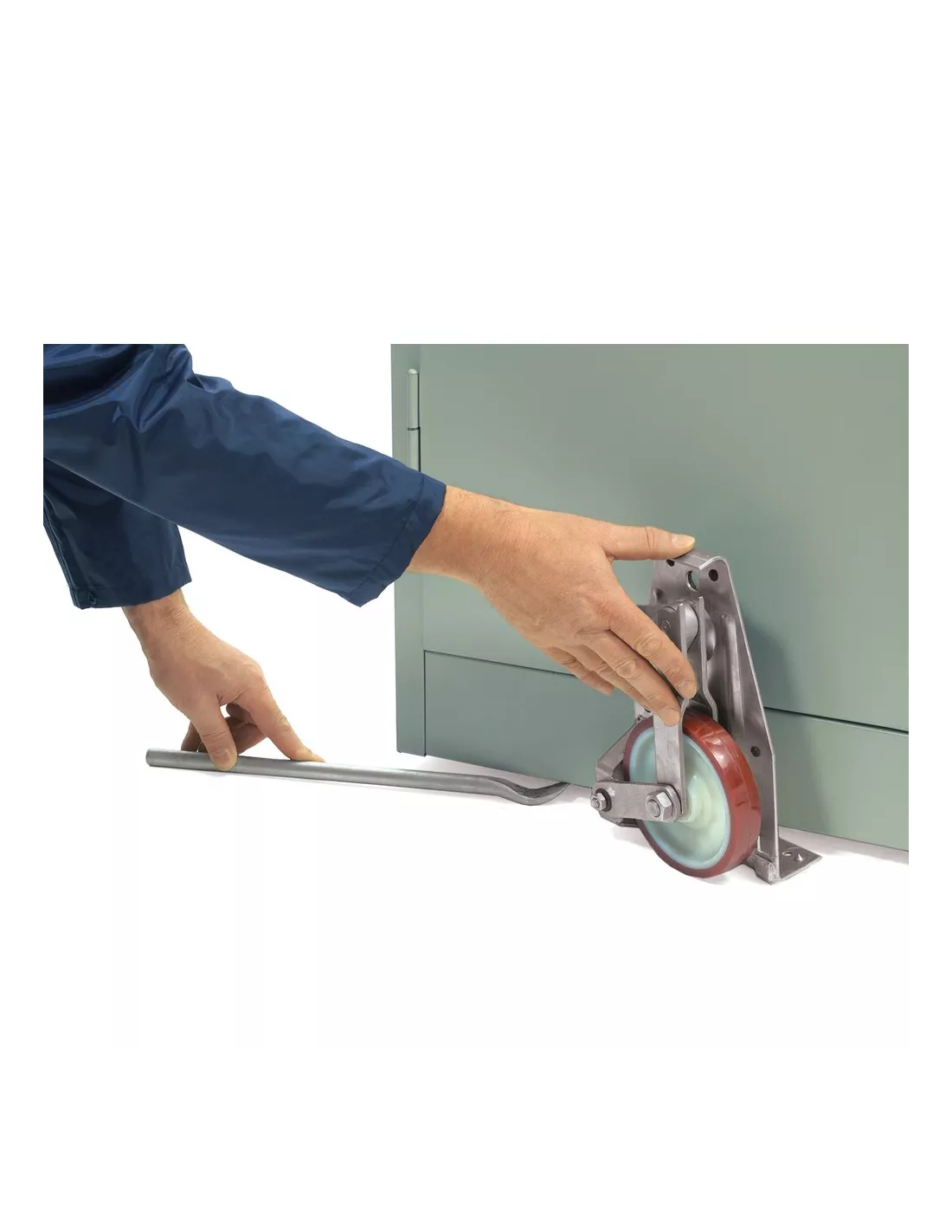 Armature en tôle d'acier zinguée. Surface en contact avec revêtement caoutchouc. Roues à bandage polyuréthane Ø 138 x 28 mm. Roulettes conçues pour le transport d'armoires lourdes. Conseils d'utilisation: Soulever la charge à l'aide de la partie plate de la barre, introduire le talon de la roulette et soulever en actionnant la barre vers soi. Procéder de la même manière avec l'autre roulette. La charge est à présent transportable. Hauteur initiale: 12 mm. Élévation au sol: 50 mm. Livraison: 2 roulettes et une barre de montée.