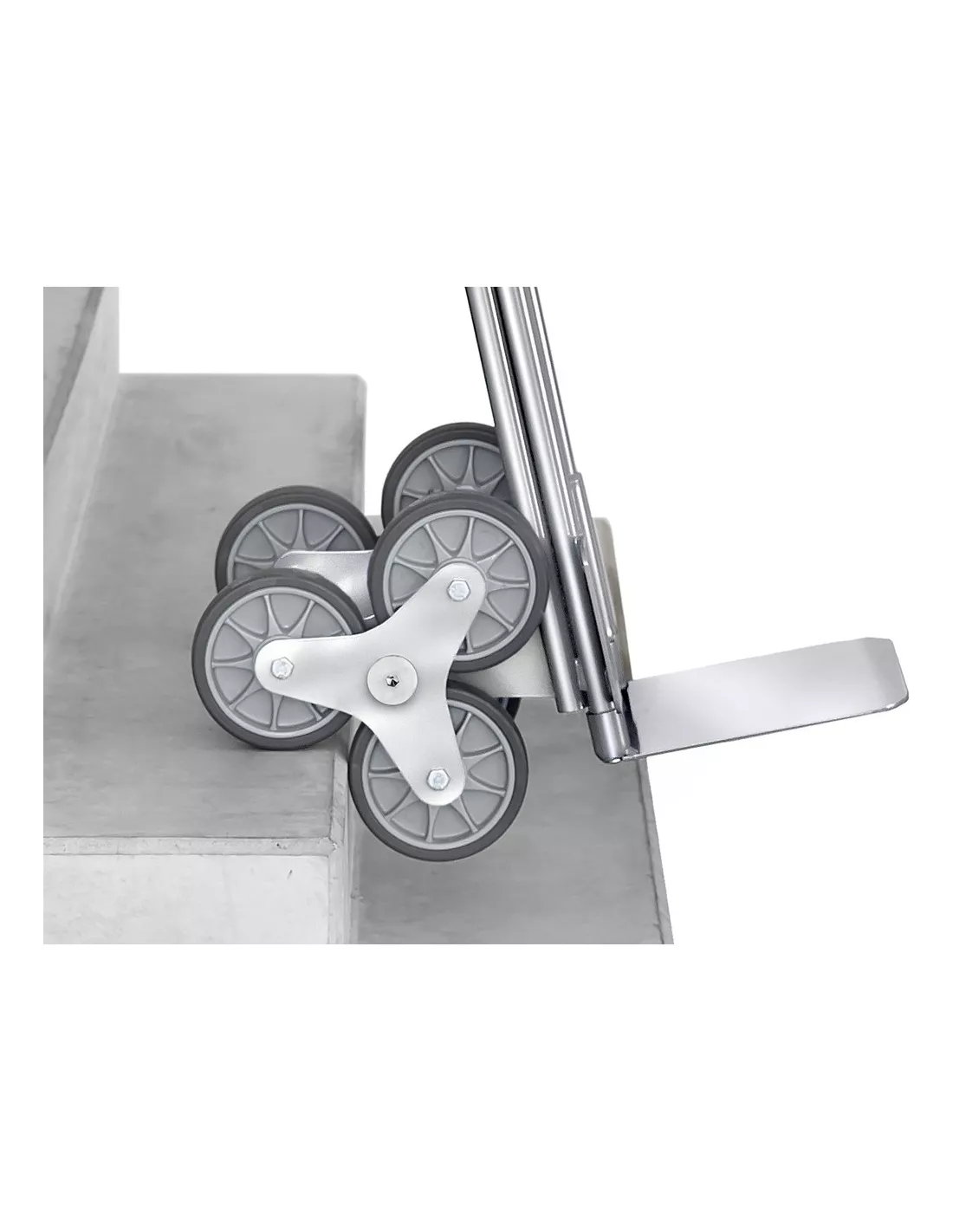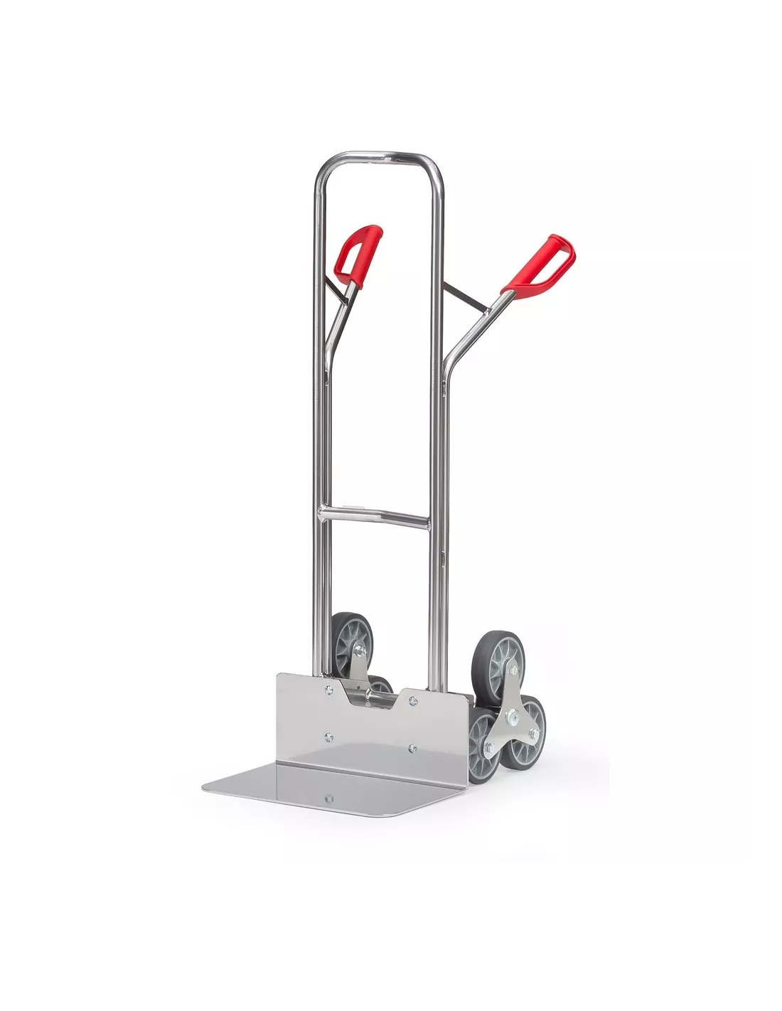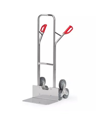Ensemble mécano-soudé en aluminium. Poignées de sécurité en plastique dur avec arceaux de sécurité. Tablier cintré permettant d'embarquer des éléments ronds tels que rouleaux, bidons, seaux etc. Bavette en tôle d'alu à boulonner et remplaçable. Roues en étoiles composées de 2 fois 3 roues à bandage TPE Ø 160 mm.