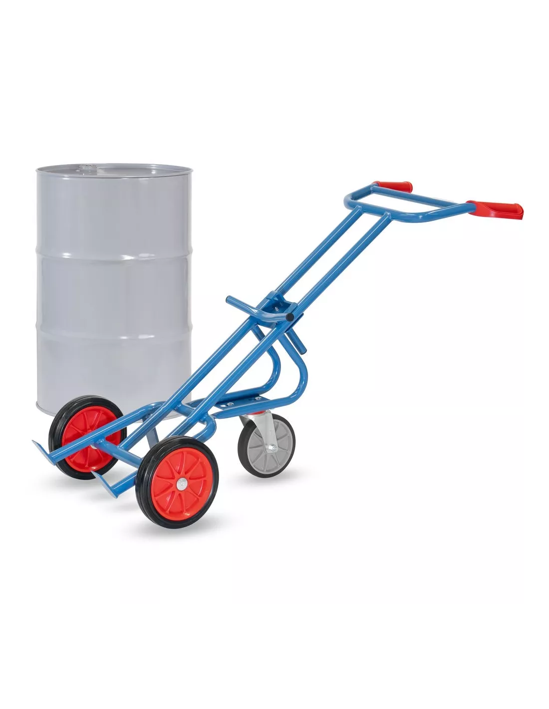 Ensemble mécano-soudé, revêtement époxy bleu RAL 5007. Diable compatible pour fûts acier de 200 litres avec rebord. Roues à bandage caoutchouc, moyeu à roulement à rouleaux. Roue directionnelle d'appui à bandage TPE Ø 200 x 40 mm. Hauteur: 1600 mm; Largeur: 680 mm.