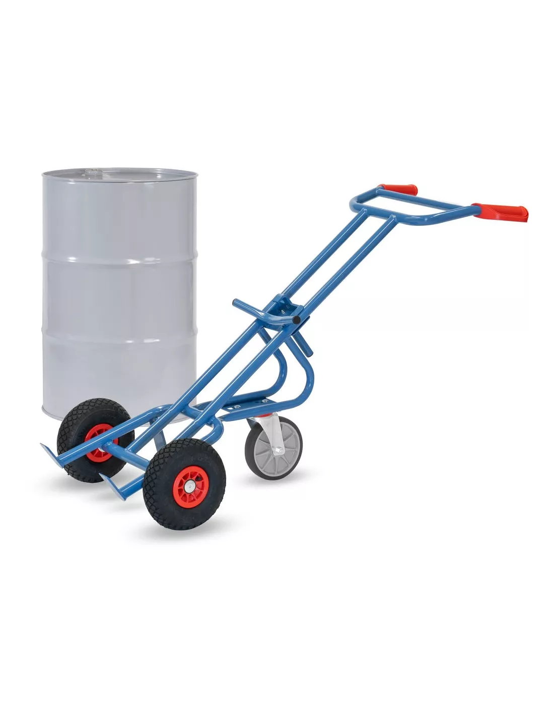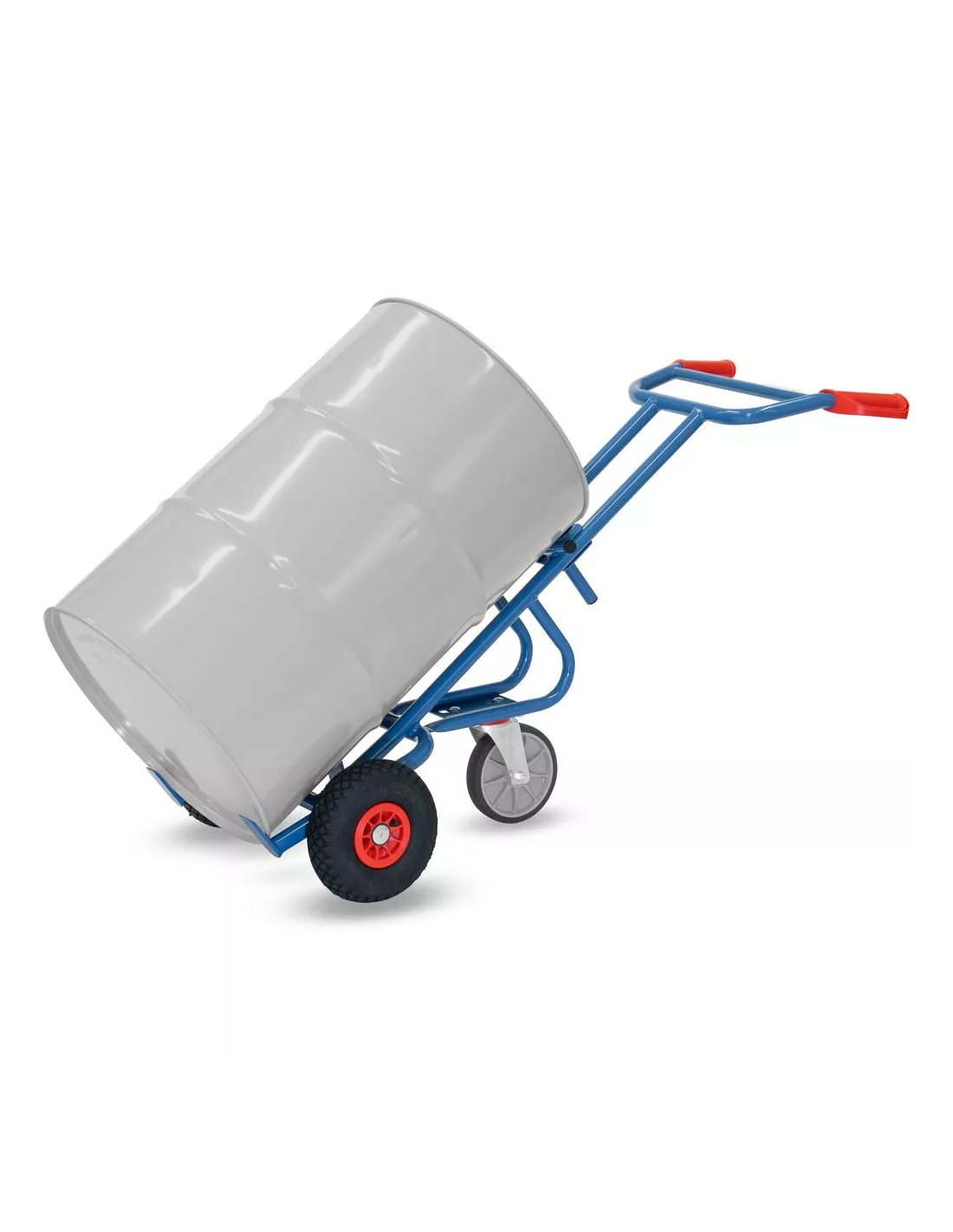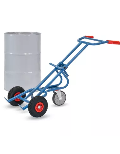 Ensemble mécano-soudé, revêtement époxy bleu RAL 5007. Diable compatible pour fûts acier de 200 litres avec rebord. Roues gonflables, moyeu à roulement à rouleaux. Roue directionnelle d'appui à bandage TPE Ø 200 x 40 mm. Hauteur: 1600 mm; Largeur: 680 mm.