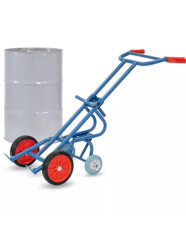 Ensemble mécano-soudé, revêtement époxy bleu RAL 5007. Diable compatible pour fûts acier de 200 litres avec rebord. Roues à bandage caoutchouc, moyeu à roulement à rouleaux. 2 roues d'appui à bandage caoutchouc bleu gris Ø 160 x 40 mm. Permet de positionner les fûts remplis de façon sûre sur des palettes ou bacs de rétention d'une hauteur jusqu'à 360 mm. Longueur: 1600 mm; Largeur: 680 mm.