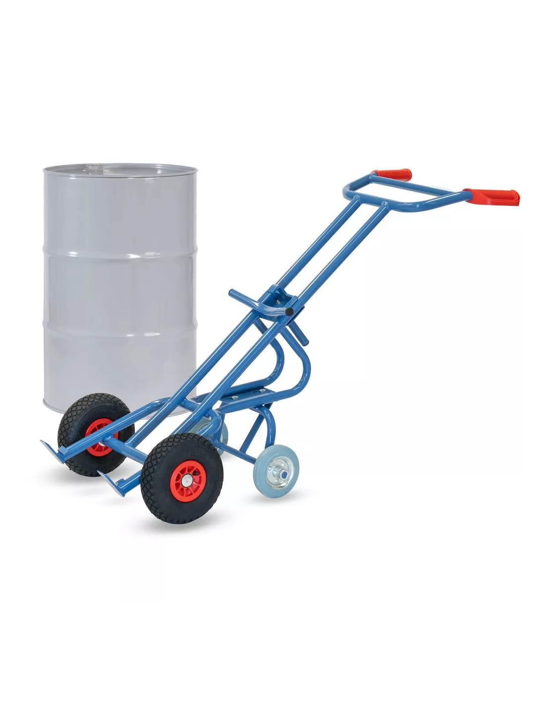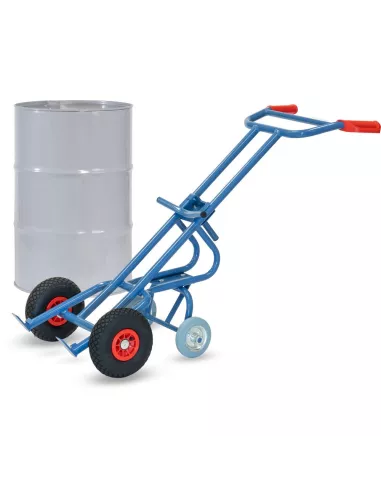 Ensemble mécano-soudé, revêtement époxy bleu RAL 5007. Diable compatible pour fûts acier de 200 litres avec rebord. Roues gonflables, moyeu à roulement à rouleaux. 2 roues d'appui à bandage caoutchouc bleu gris Ø 160 x 40 mm. Permet de positionner les fûts remplis de façon sûre sur des palettes ou bacs de rétention d'une hauteur jusqu'à 360 mm. Longueur: 1600 mm; Largeur: 680 mm.