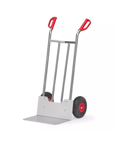 Ensemble mécano-soudé en aluminium. Soigneusement soudé sans revêtement, léger et maniable. Poignées de sécurité en plastique dur. Tablier cintré permettant d'embarquer des éléments ronds tels que rouleaux, bidons, seaux etc. Bavette en tôle d'alu à boulonner et remplaçable. Roues en mousse polyuréthane increvables, moyeu à roulement à rouleaux. Livré avec bavette démontée.