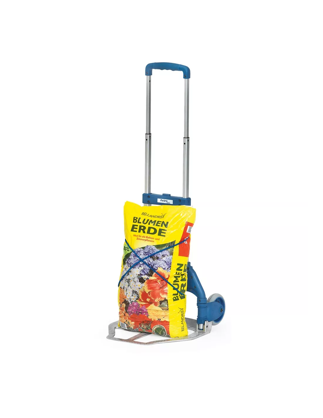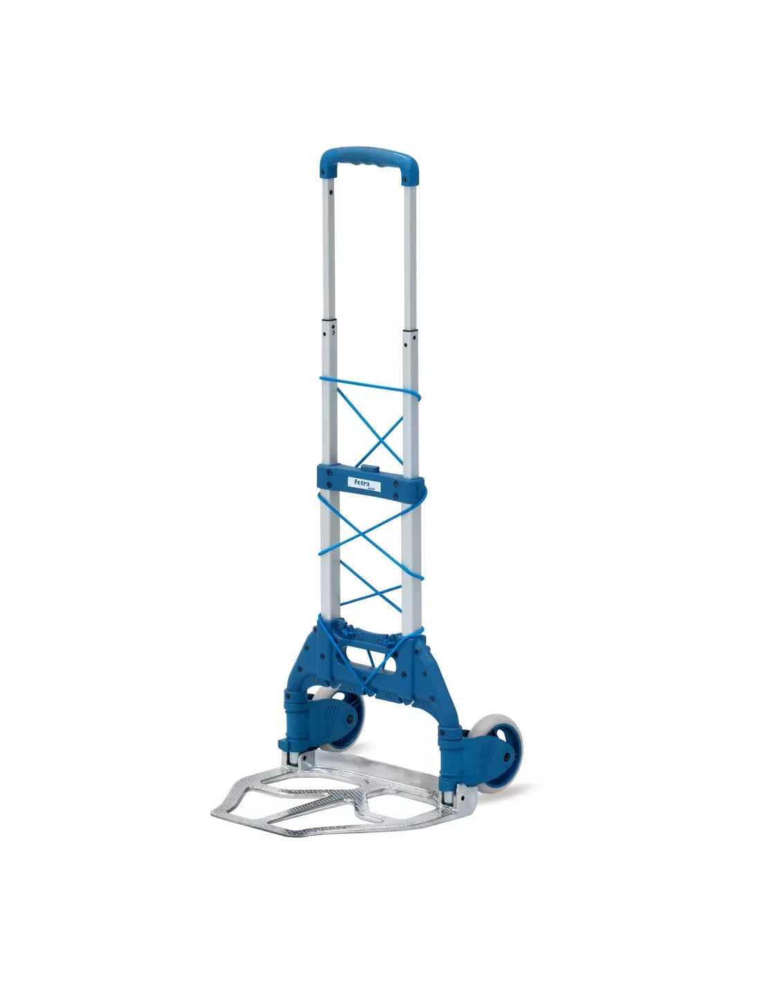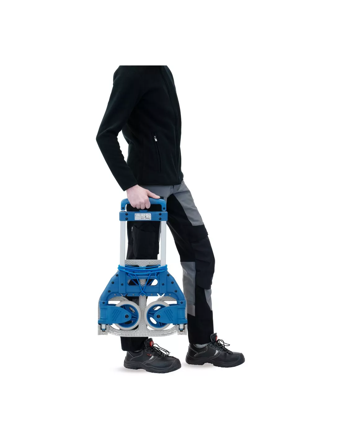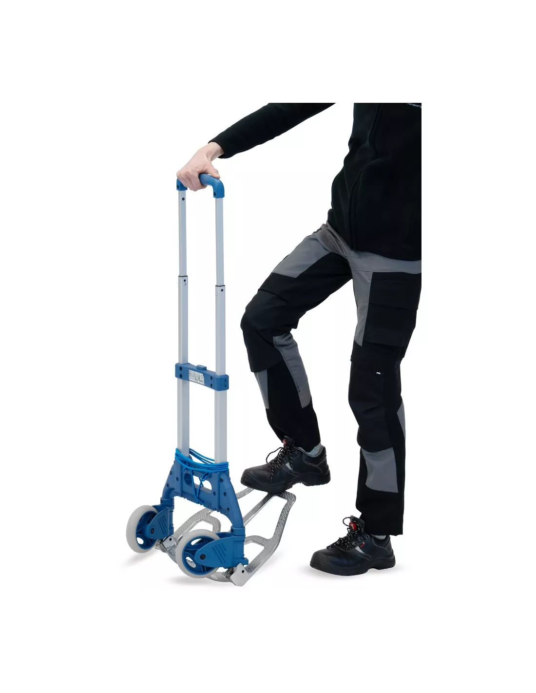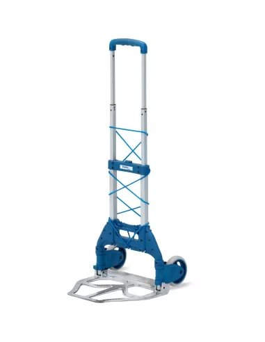 Fabrication de grande qualité en tube d'aluminium avec bavette en aluminium et parties en plastique de première qualité. Poignée de sécurité en plastique agréable au toucher. Sandow pour sécuriser les charges. Mise en place des roues et bavettes en quelques secondes. Roues à bandage polymère bleu gris "non traçant", moyeu à roulement à rouleaux. Dimensions replié (hxlxp): 595 x 390 x 50 mm.