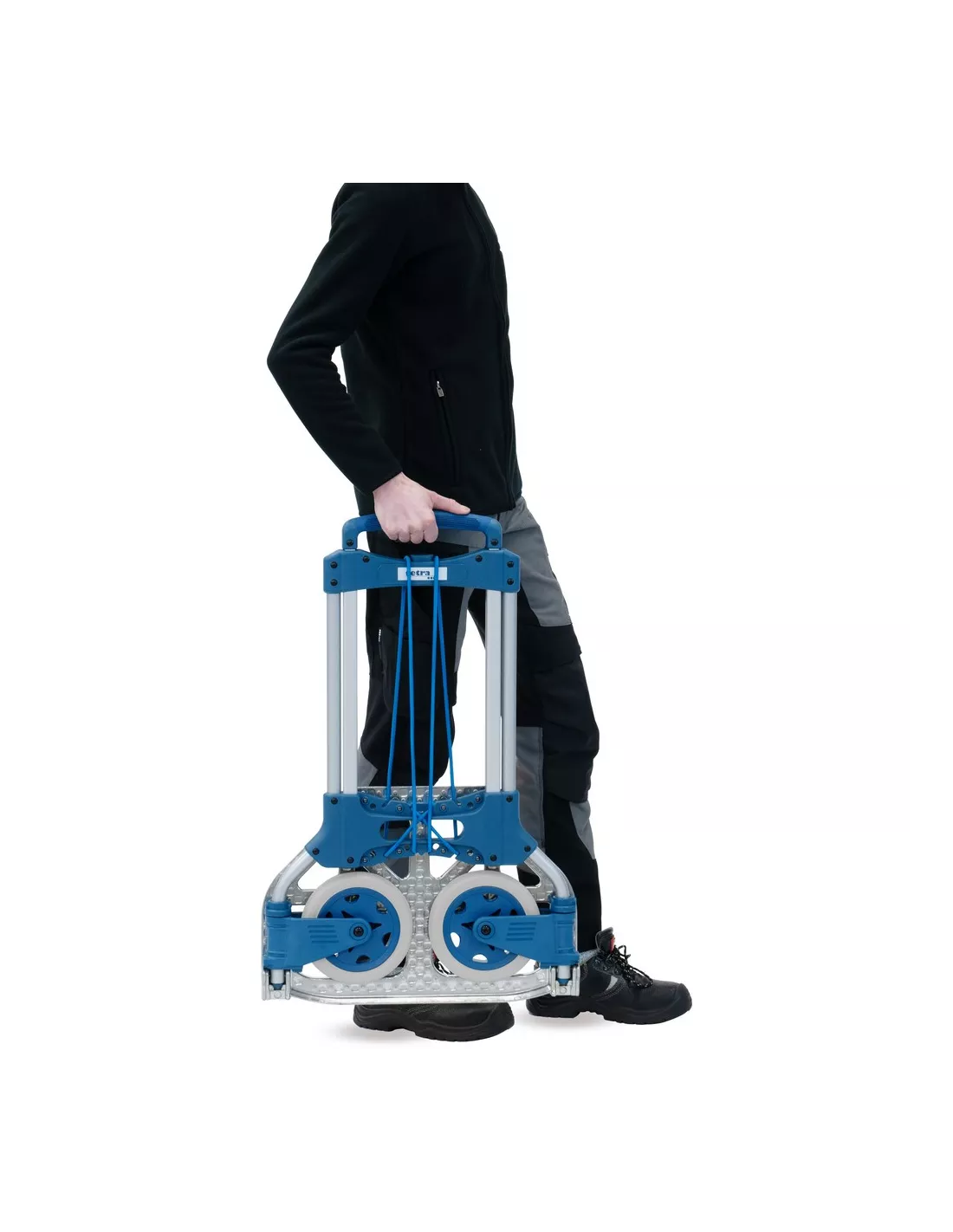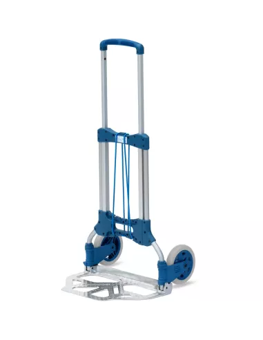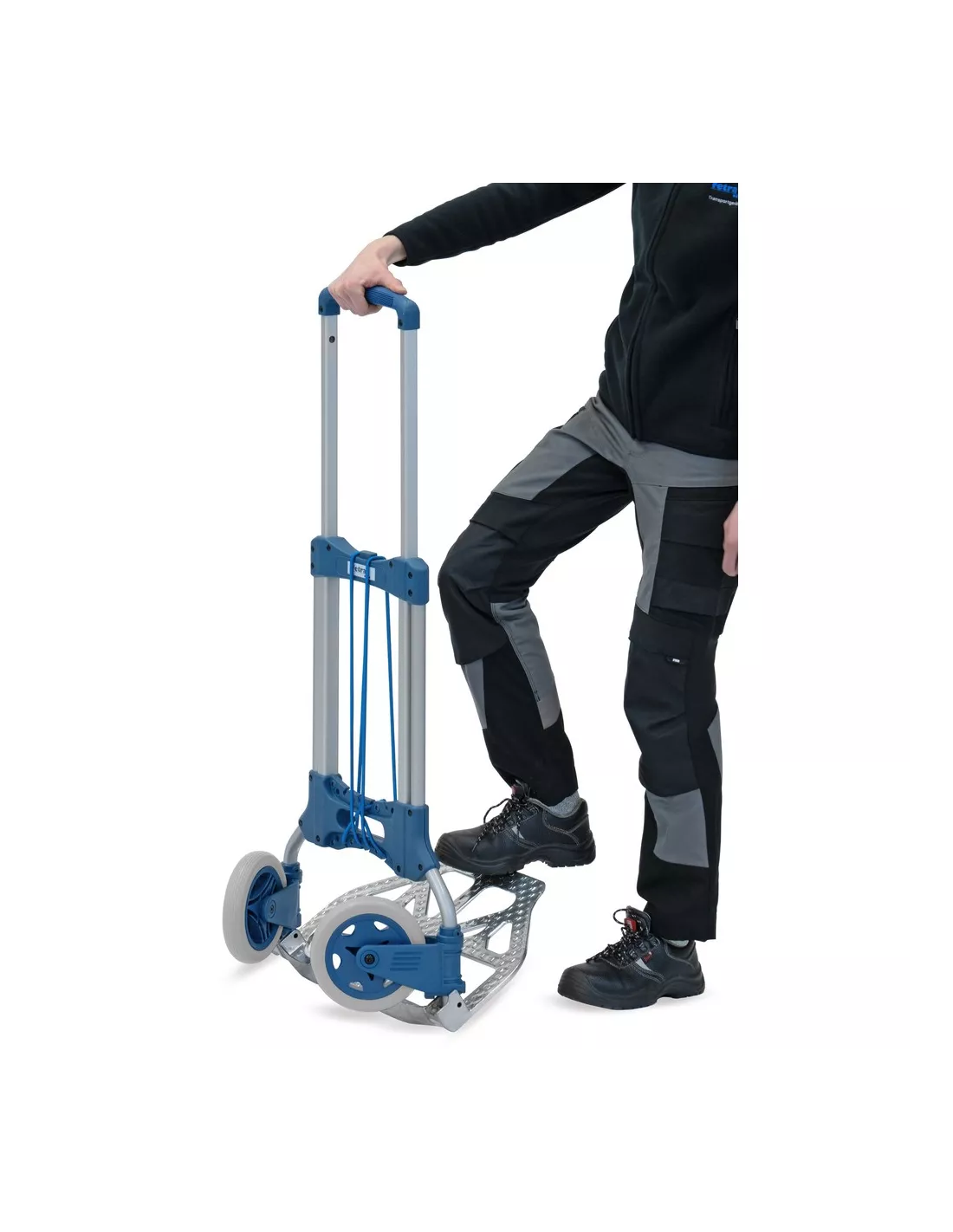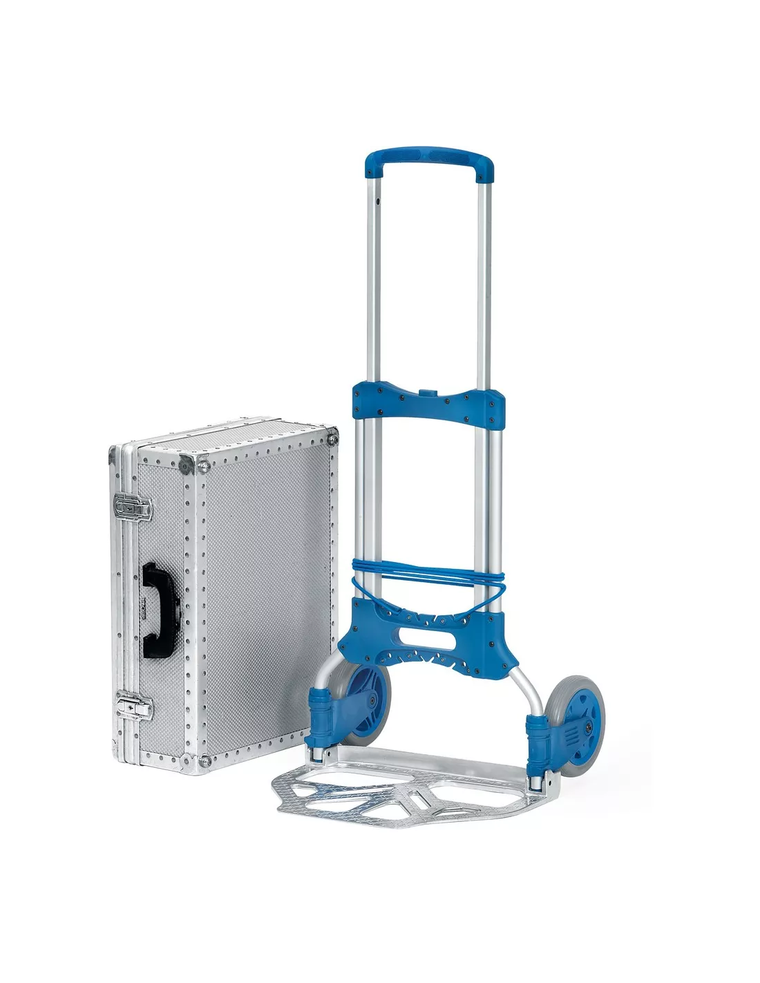 Fabrication de grande qualité en tube d'aluminium avec bavette en aluminium et parties en plastique de première qualité. Poignée de sécurité en plastique agréable au toucher. Sandow pour sécuriser les charges. Mise en place des roues et bavettes en quelques secondes. Roues à bandage polymère bleu gris "non traçant", moyeu à roulement à rouleaux. Dimensions replié (hxlxp): 765 x 488 x 64 mm.
