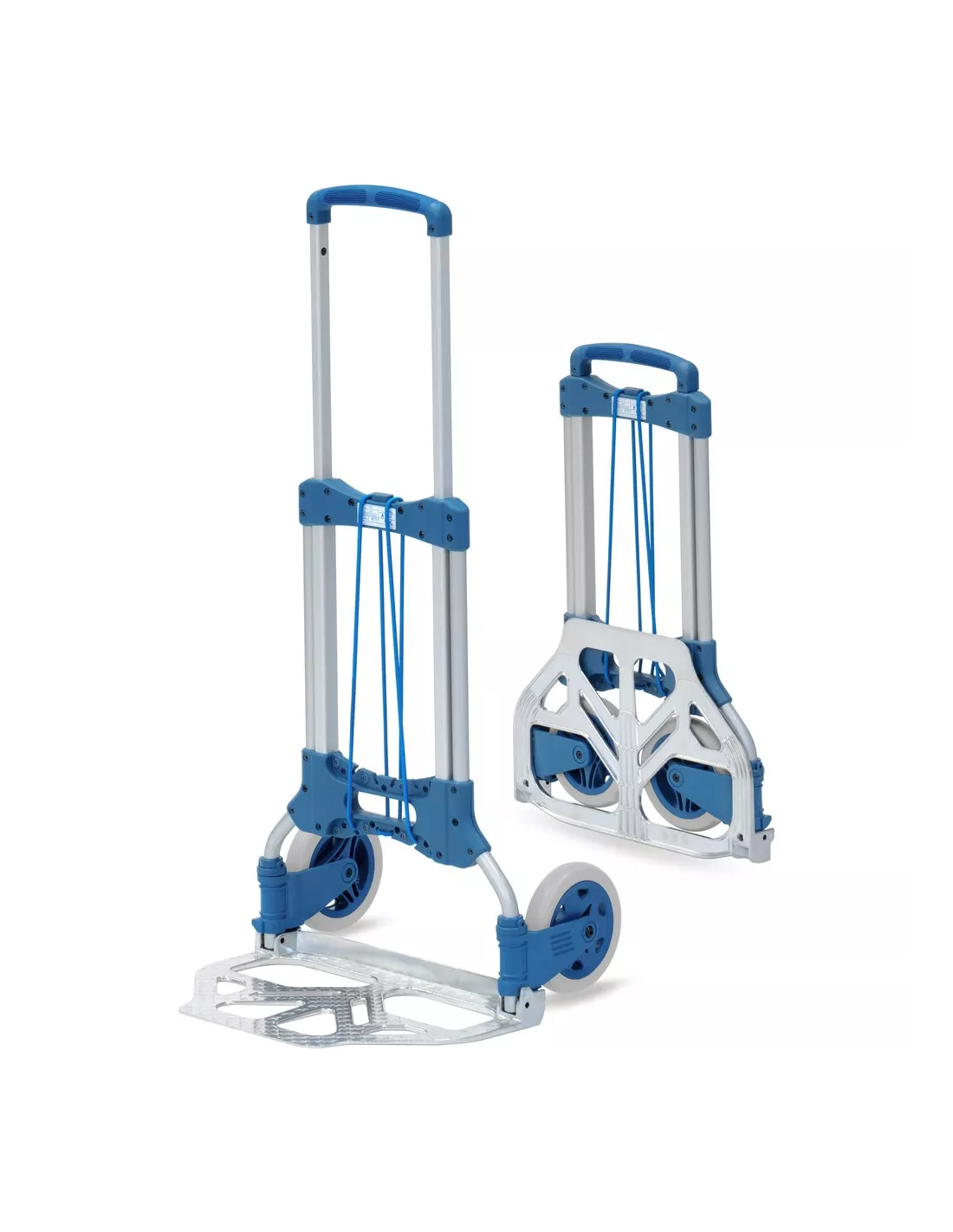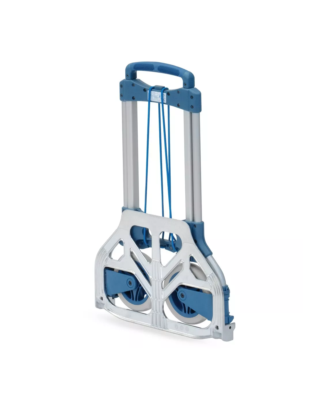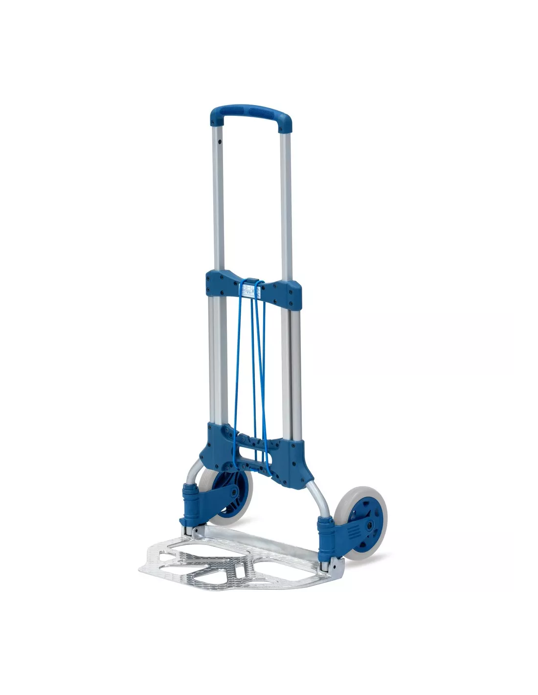 Fabrication de grande qualité en tube d'aluminium avec bavette en aluminium et parties en plastique de première qualité. Poignée de sécurité en plastique agréable au toucher. Sandow pour sécuriser les charges. Mise en place des roues et bavettes en quelques secondes. Roues à bandage polymère bleu gris "non traçant", moyeu à roulement à rouleaux. Dimensions replié (hxlxp): 765 x 488 x 64 mm.