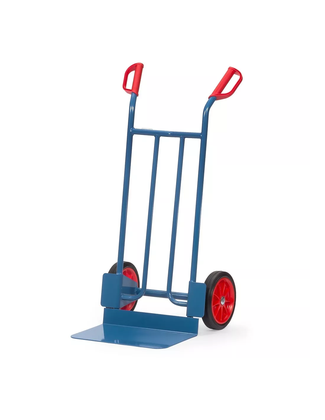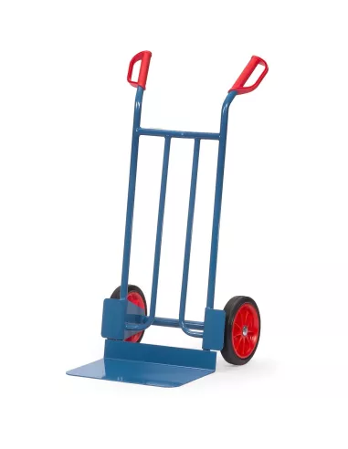 Ensemble mécano-soudé en tube et tôle d'acier, revêtement époxy bleu RAL 5007. Poignées de sécurité en plastique dur avec arceaux de sécurité. Bavette en tôle d'acier à boulonner et remplaçable. Roues à bandage caoutchouc, moyeu à roulement à rouleaux. Livré avec bavette démontée.