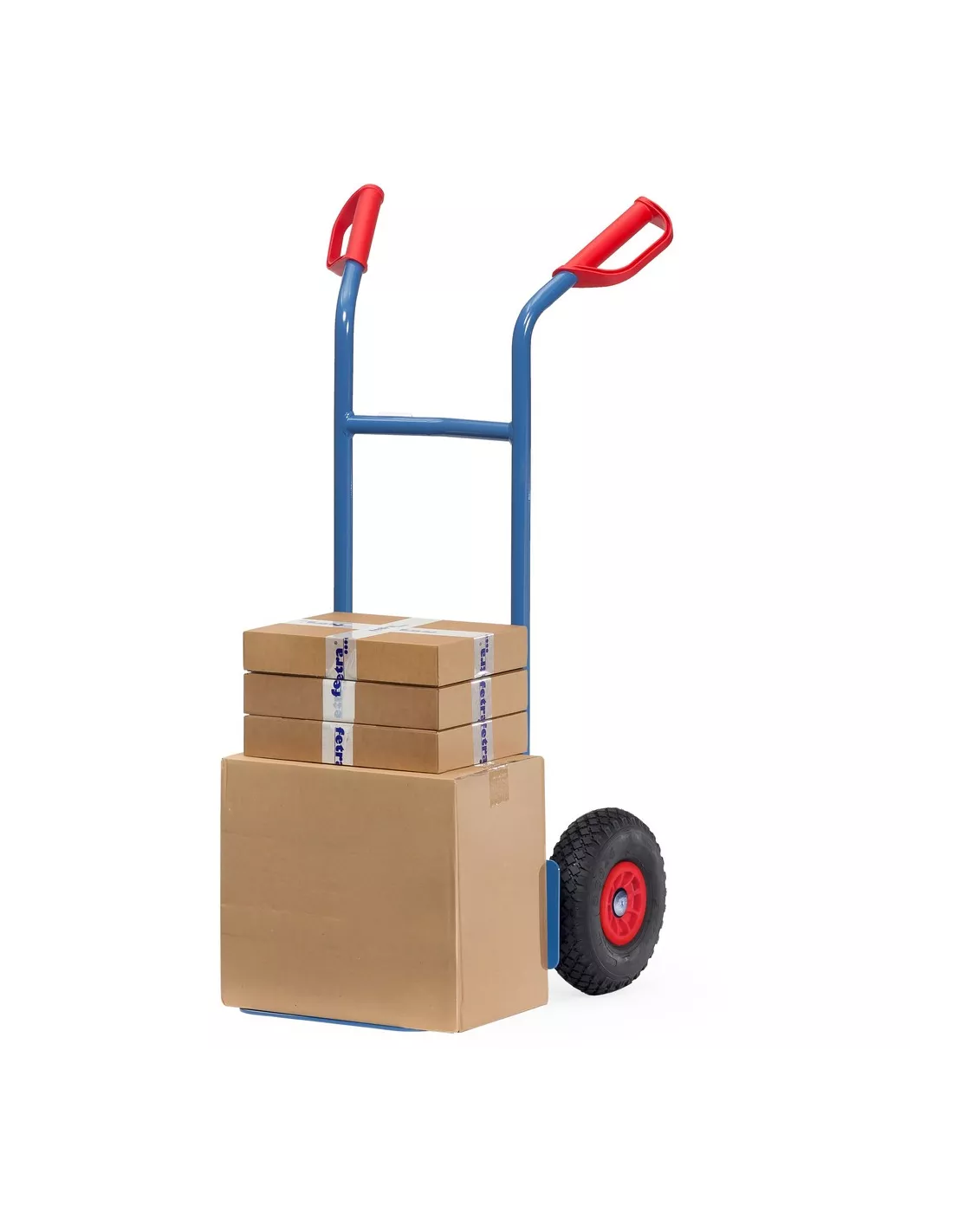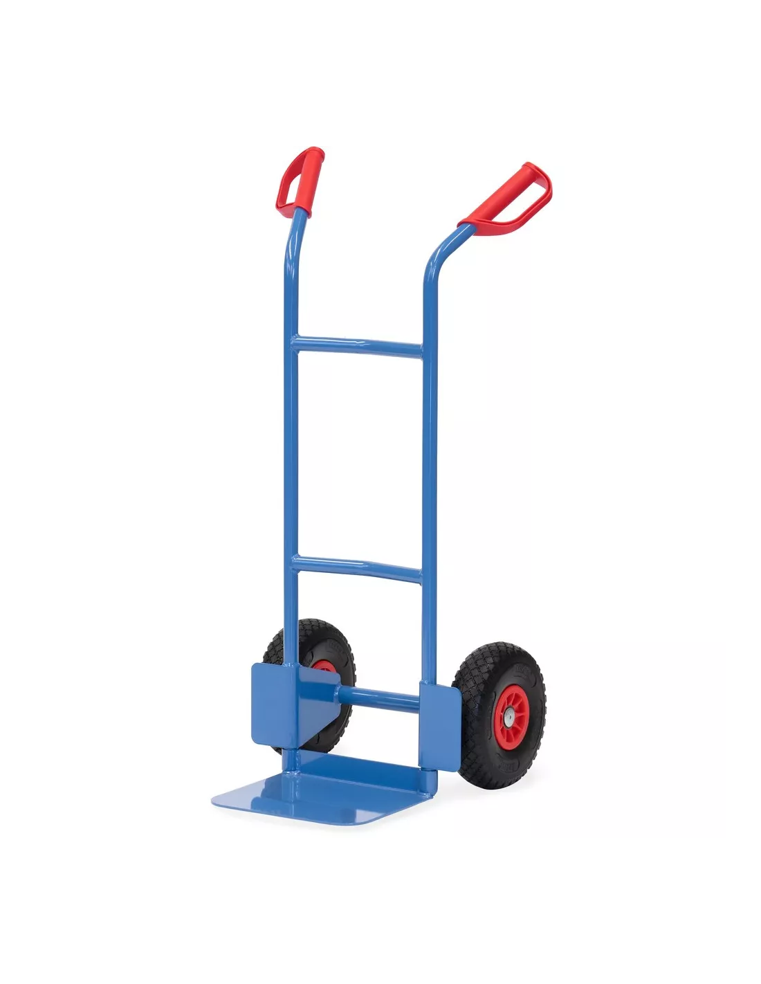 Ensemble mécano-soudé en tube et tôle d'acier, revêtement époxy bleu RAL 5007. Poignées de sécurité en plastique dur avec arceaux de sécurité. Bavette en tôle d'acier à boulonner et remplaçable. Roues en mousse polyuréthane increvables, moyeu à roulement à rouleaux. Tablier cintré permettant d'embarquer des éléments ronds tels que rouleaux, bidons, seaux etc. Livré avec bavette démontée.