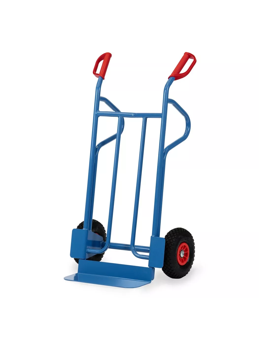 Ensemble mécano-soudé en tube et tôle d'acier, revêtement époxy bleu RAL 5007. Poignées de sécurité en plastique dur avec arceaux de sécurité. Bavette en tôle d'acier à boulonner et remplaçable. Roues en mousse polyuréthane increvables, moyeu à roulement à rouleaux. Livré avec bavette démontée.
