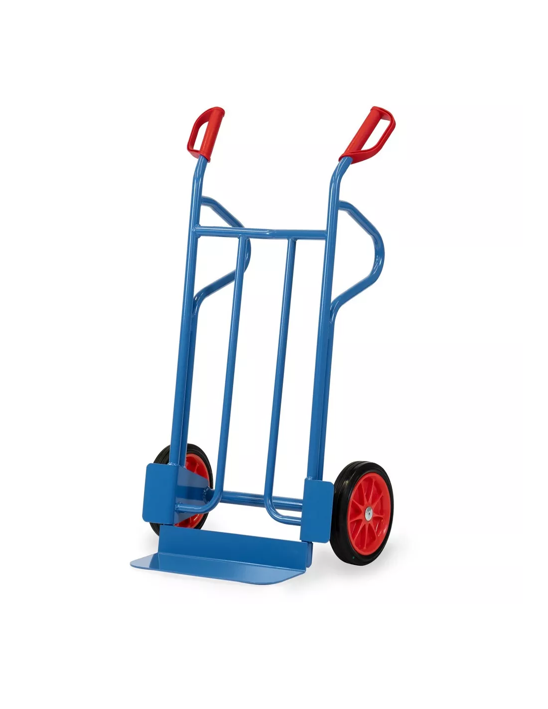 Ensemble mécano-soudé en tube et tôle d'acier, revêtement époxy bleu RAL 5007. Poignées de sécurité en plastique dur avec arceaux de sécurité. Bavette en tôle d'acier à boulonner et remplaçable. Roues à bandage caoutchouc, moyeu à roulement à rouleaux. Livré avec bavette démontée.