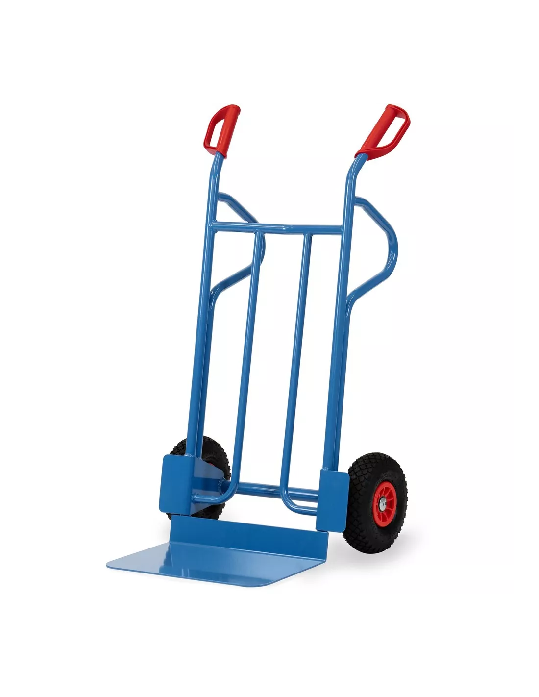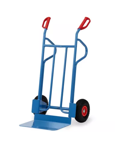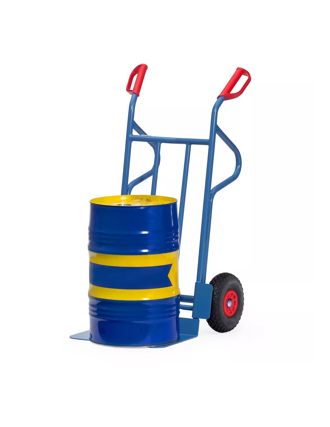 Ensemble mécano-soudé en tube et tôle d'acier, revêtement époxy bleu RAL 5007. Poignées de sécurité en plastique dur avec arceaux de sécurité. Bavette en tôle d'acier à boulonner et remplaçable. Roues en mousse polyuréthane increvables, moyeu à roulement à rouleaux. Livré avec bavette démontée.