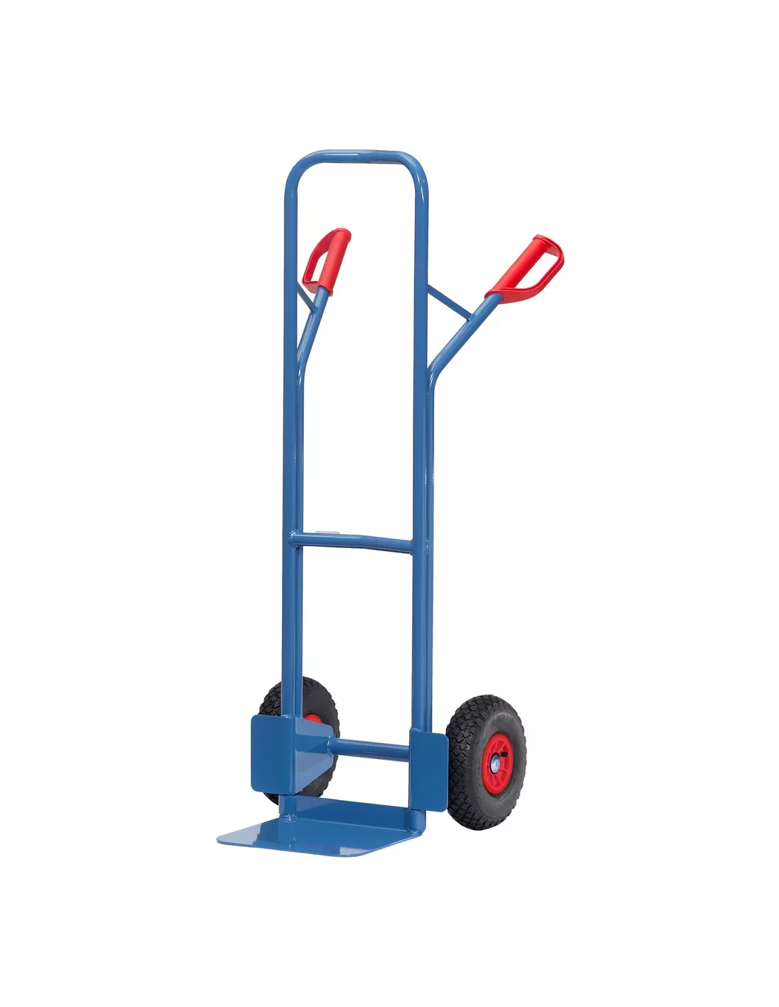 Ensemble mécano-soudé en tube et tôle d'acier, revêtement époxy bleu RAL 5007. Poignées de sécurité en plastique dur avec arceaux de sécurité. Bavette en tôle d'acier à boulonner et remplaçable. Roues gonflables, moyeu à roulement à rouleaux. Tablier cintré permettant d'embarquer des éléments ronds tels que rouleaux, bidons, seaux etc. Livré avec bavette démontée.