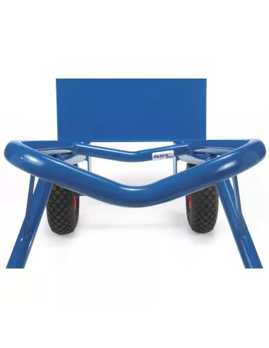 Ensemble mécano-soudé en tube et tôle d'acier, revêtement époxy bleu RAL 5007. Poignées de sécurité en plastique dur avec arceaux de sécurité. Bavette en tôle d'acier à boulonner et remplaçable. Roues à bandage caoutchouc, moyeu à roulement à rouleaux. Tablier cintré permettant d'embarquer des éléments ronds tels que rouleaux, bidons, seaux etc. Livré avec bavette démontée.
