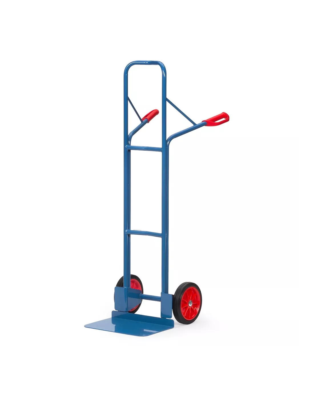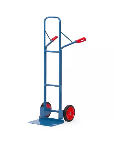 Ensemble mécano-soudé en tube et tôle d'acier, revêtement époxy bleu RAL 5007. Poignées de sécurité en plastique dur avec arceaux de sécurité. Bavette en tôle d'acier à boulonner et remplaçable. Roues à bandage caoutchouc, moyeu à roulement à rouleaux. Tablier cintré permettant d'embarquer des éléments ronds tels que rouleaux, bidons, seaux etc. Livré avec bavette démontée.