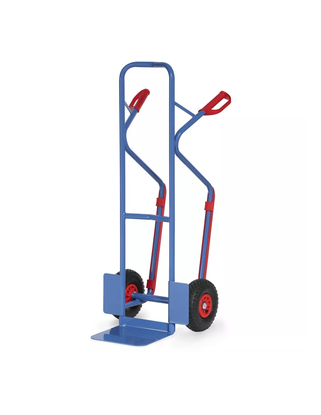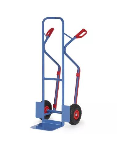 Ensemble mécano-soudé en tube et tôle d'acier, revêtement époxy bleu RAL 5007. Poignées de sécurité en plastique dur avec arceaux de sécurité et patins amovibles. Bavette en tôle d'acier à boulonner et remplaçable. Roues gonflables, moyeu à roulement à rouleaux. Tablier cintré permettant d'embarquer des éléments ronds tels que rouleaux, bidons, seaux etc. Livré avec bavette démontée.