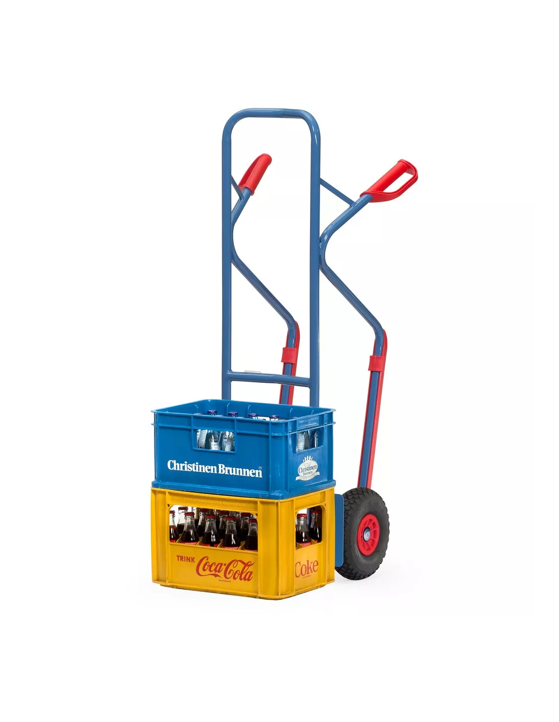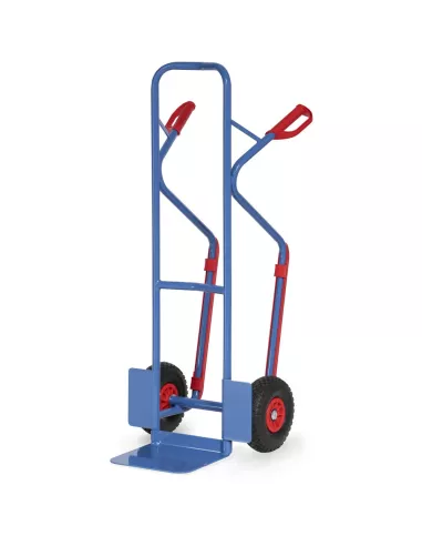 Ensemble mécano-soudé en tube et tôle d'acier, revêtement époxy bleu RAL 5007. Poignées de sécurité en plastique dur avec arceaux de sécurité et patins amovibles. Bavette en tôle d'acier à boulonner et remplaçable. Roues en mousse polyuréthane increvables, moyeu à roulement à rouleaux. Tablier cintré permettant d'embarquer des éléments ronds tels que rouleaux, bidons, seaux etc. Livré avec bavette démontée.