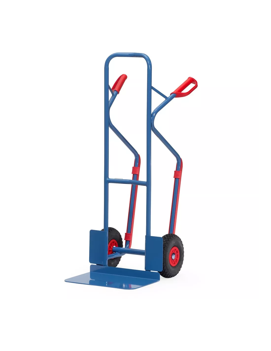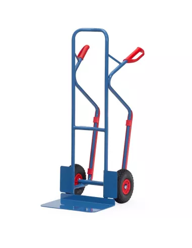 Ensemble mécano-soudé en tube et tôle d'acier, revêtement époxy bleu RAL 5007. Poignées de sécurité en plastique dur avec arceaux de sécurité et patins amovibles. Bavette en tôle d'acier à boulonner et remplaçable. Roues en mousse polyuréthane increvables, moyeu à roulement à rouleaux. Tablier cintré permettant d'embarquer des éléments ronds tels que rouleaux, bidons, seaux etc. Livré avec bavette démontée.