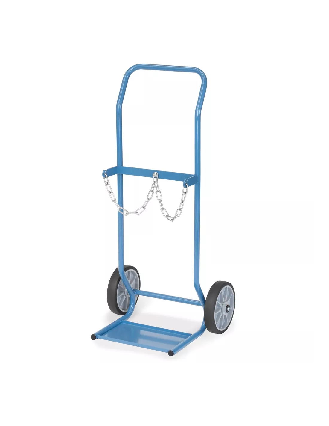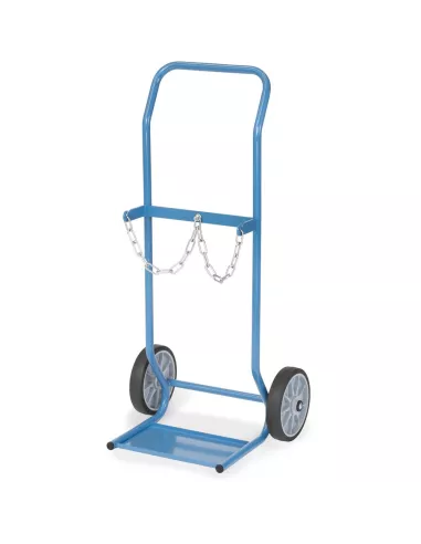 Tube d'acier soudé, revêtement époxy bleu RAL 5007. Diable porte-bouteilles avec chaîne de maintien. Pour 2 bouteilles de 10 litres, Ø 140 mm. Roues à roulement à rouleaux.