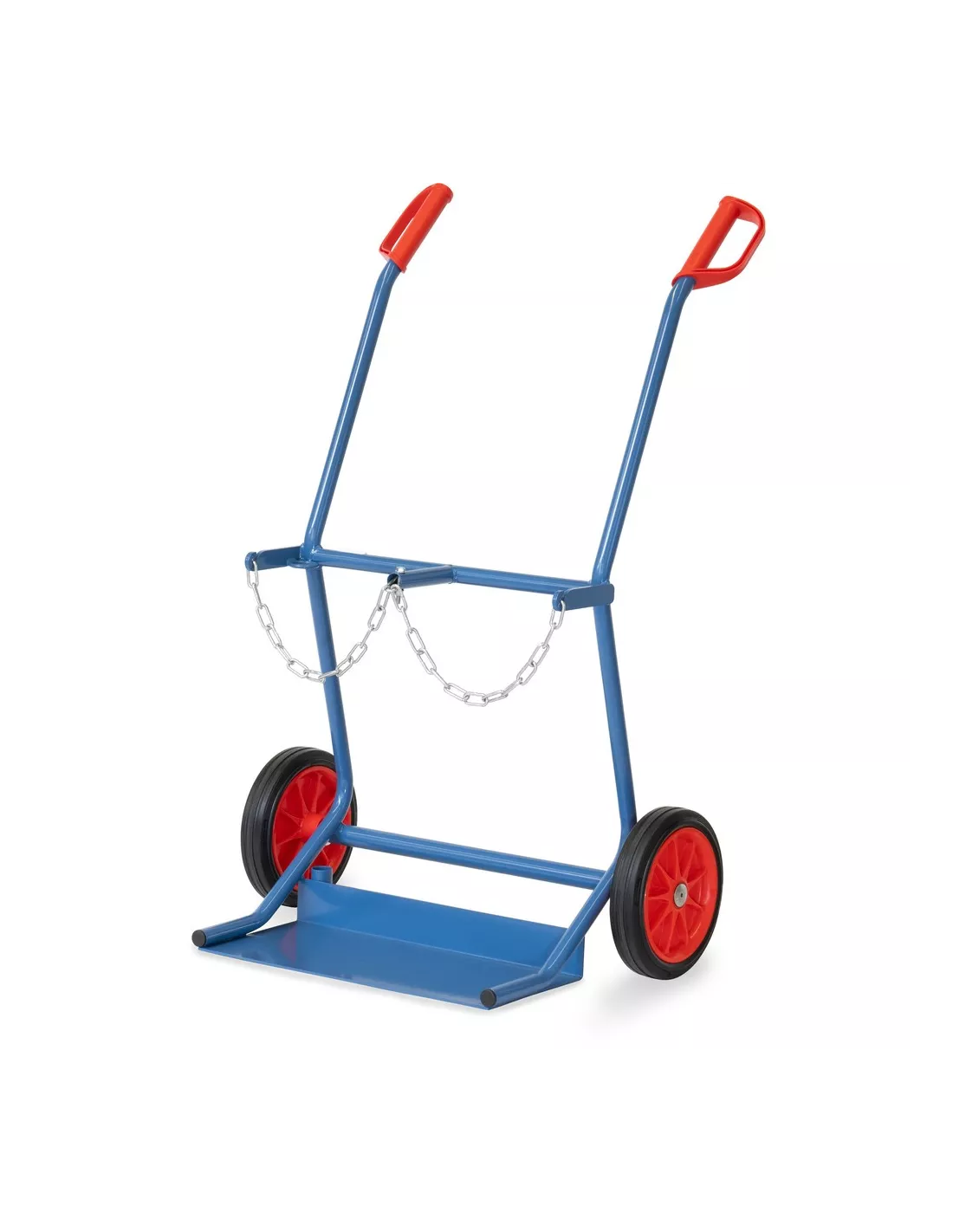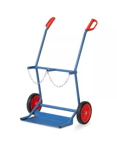 Tube d'acier soudé, revêtement époxy bleu RAL 5007. Diable porte-bouteilles avec chaîne de maintien. Pour 2 bouteilles de 20 litres, Ø 204 mm. Roues à bandage caoutchouc, moyeu à roulement à rouleaux.