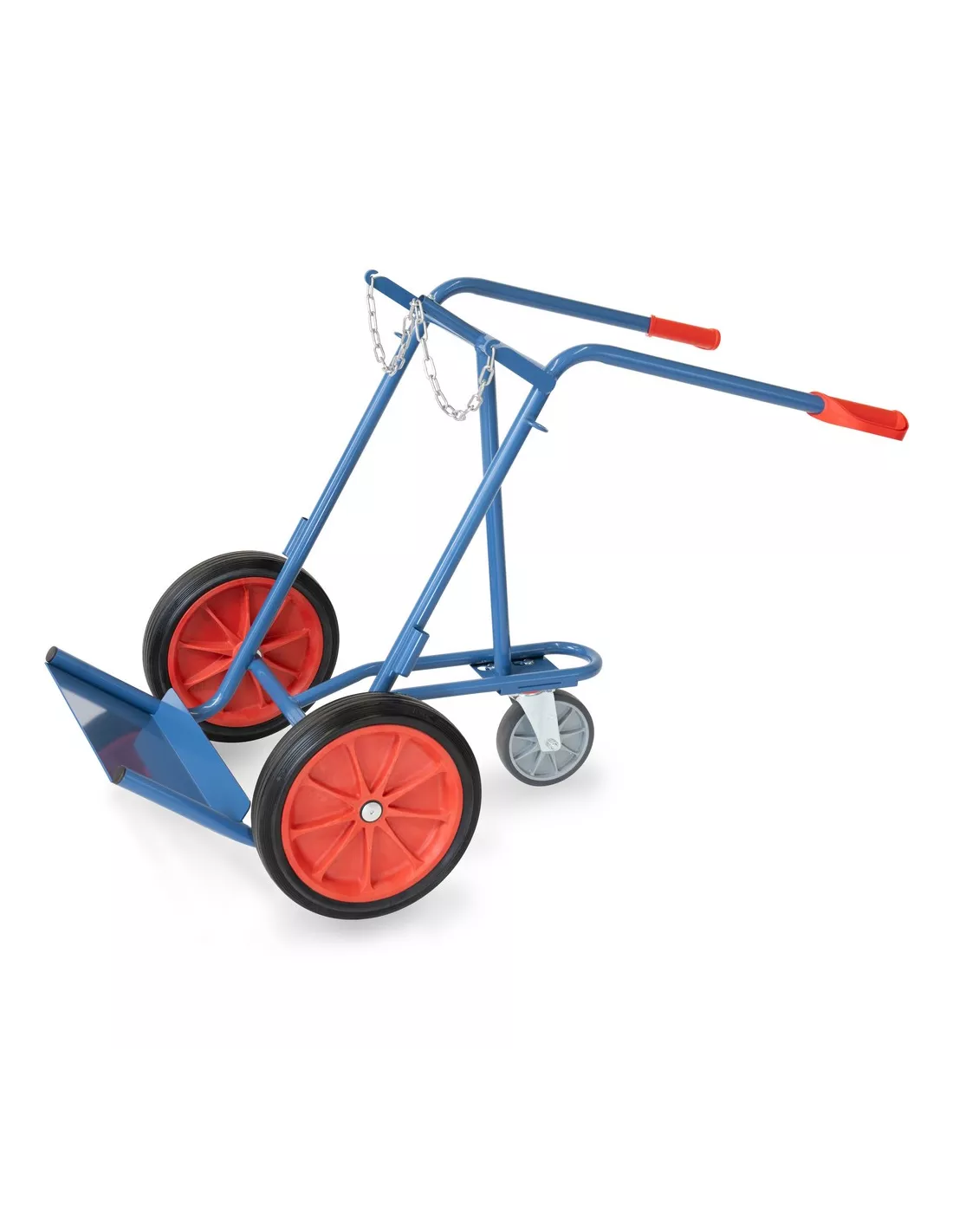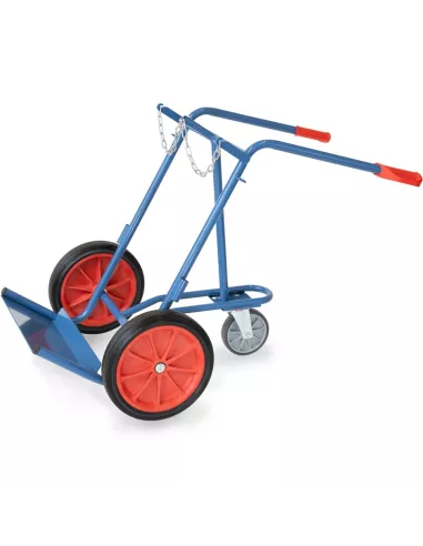 Tube d'acier soudé, revêtement époxy bleu RAL 5007. Diable porte-bouteilles avec chaîne de maintien. Pour 2 bouteilles de 40 à 50 litres, Ø 204-229 mm. Carquois porte-baguettes de soudage de chaque côté. Roues à bandage caoutchouc, moyeu à roulement à rouleaux et une roue support à bandage TPE Ø 200 x 40 mm.