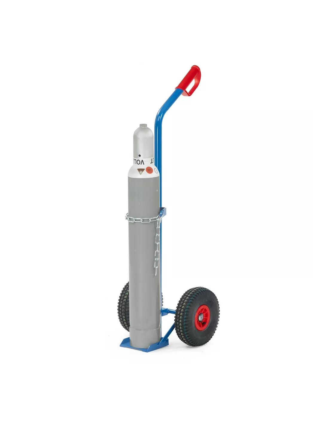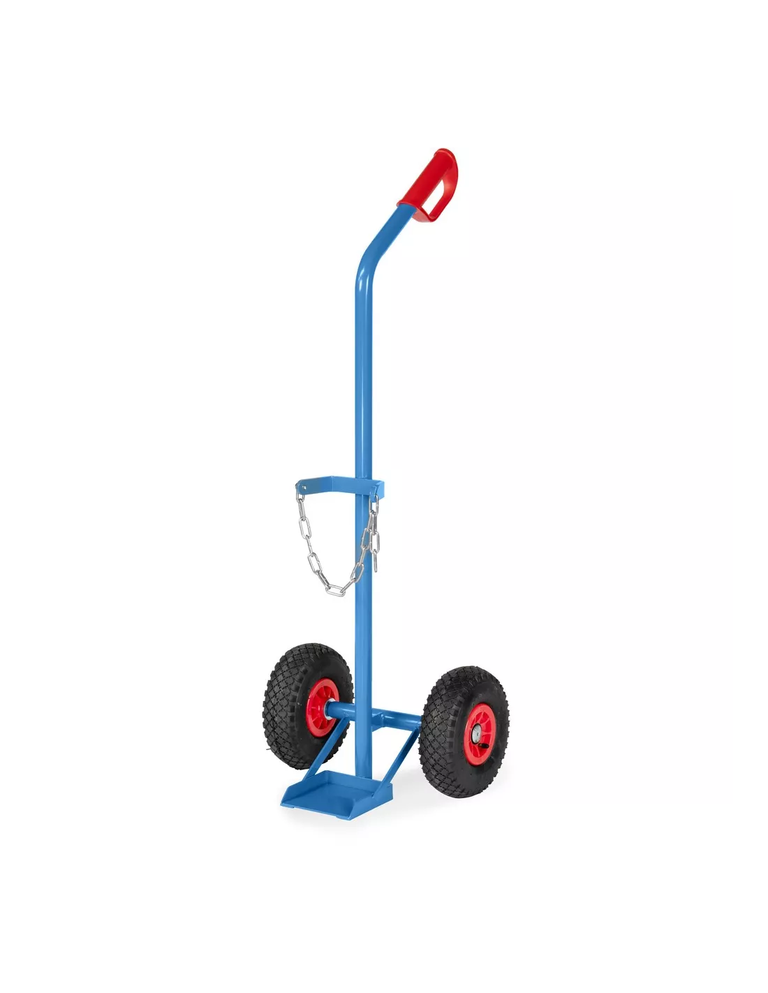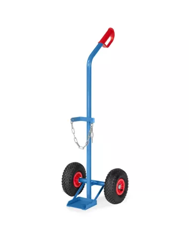 Tube d'acier soudé, revêtement époxy bleu RAL 5007. Diable porte-bouteilles avec chaîne de maintien. Pour 1 bouteille de 10 litres, Ø 140 mm. Roues gonflables, moyeu à roulement à rouleaux.