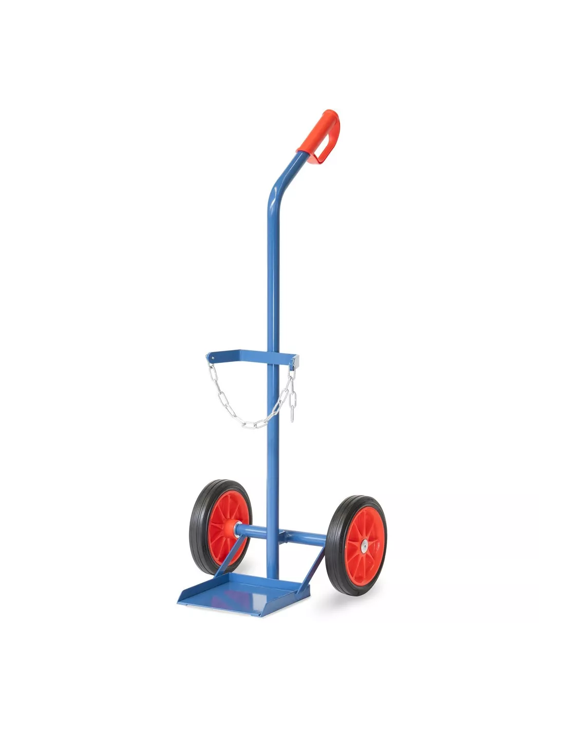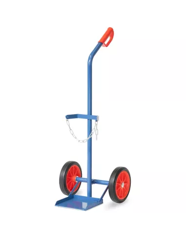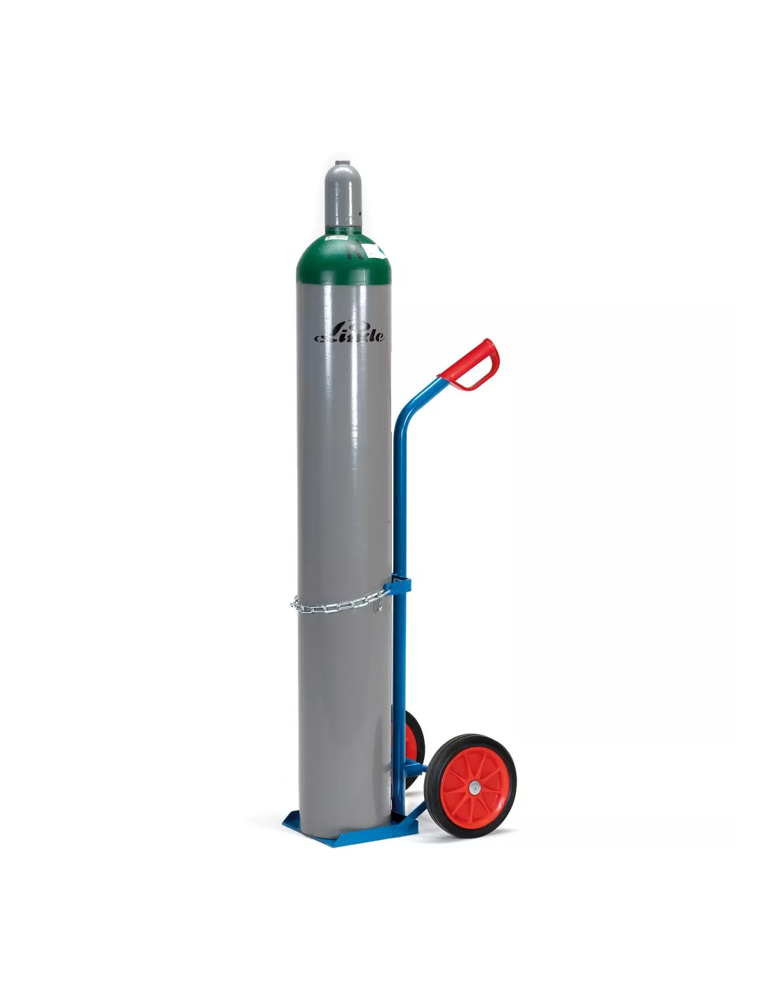 Tube d'acier soudé, revêtement époxy bleu RAL 5007. Diable porte-bouteilles avec chaîne de maintien. Pour 1 bouteille de propane de 20,40 ou 50 litres, Ø 204-229 mm. Roues à bandage caoutchouc, moyeu à roulement à rouleaux.