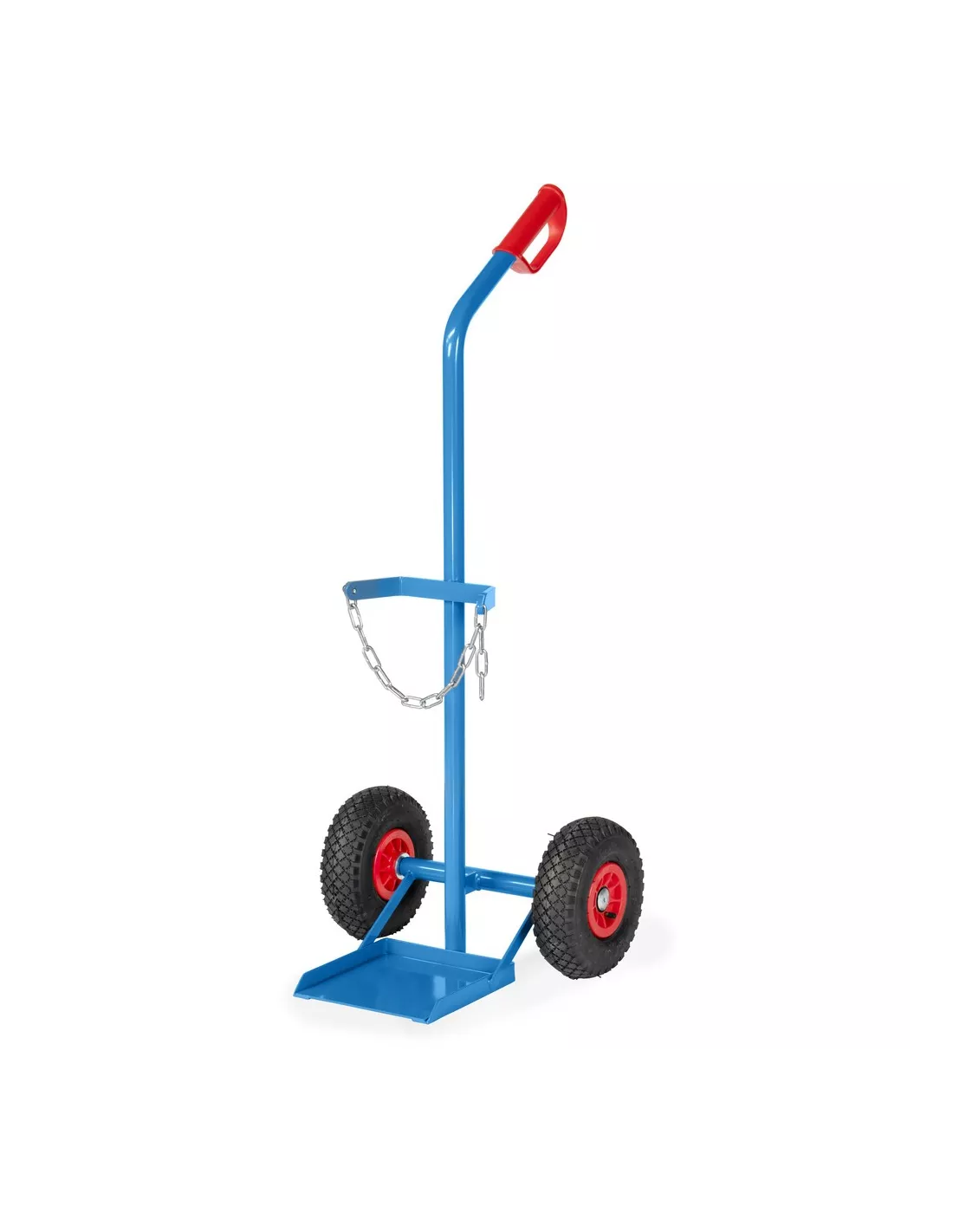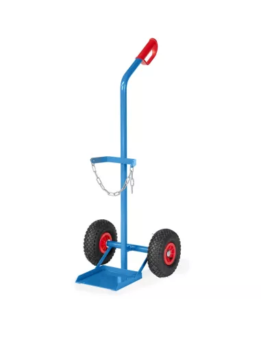Tube d'acier soudé, revêtement époxy bleu RAL 5007. Diable porte-bouteilles avec chaîne de maintien. Pour 1 bouteille de propane de 20,40 ou 50 litres, Ø 204-229 mm. Roues gonflables, moyeu à roulement à rouleaux.