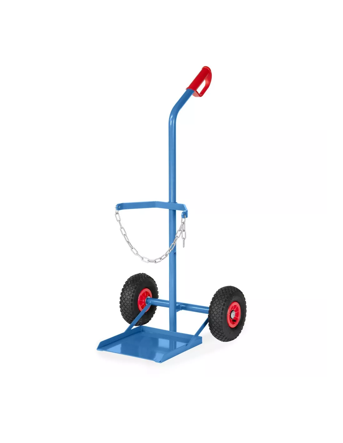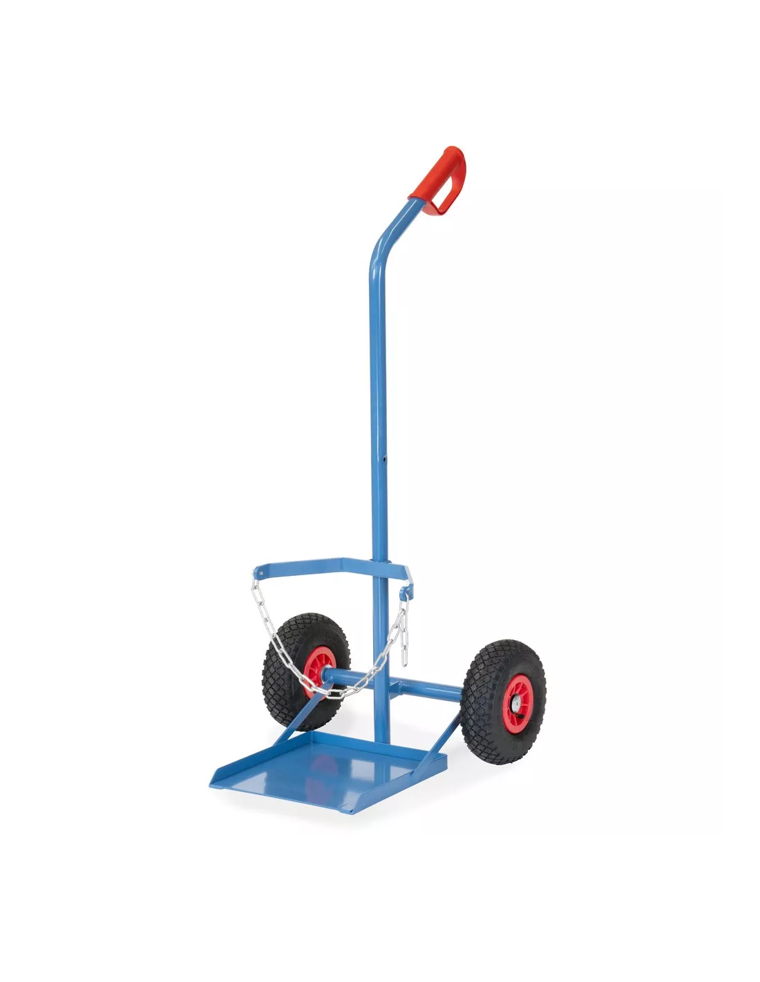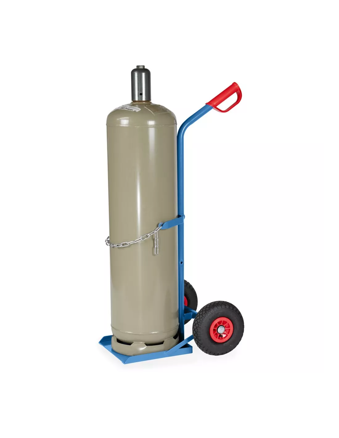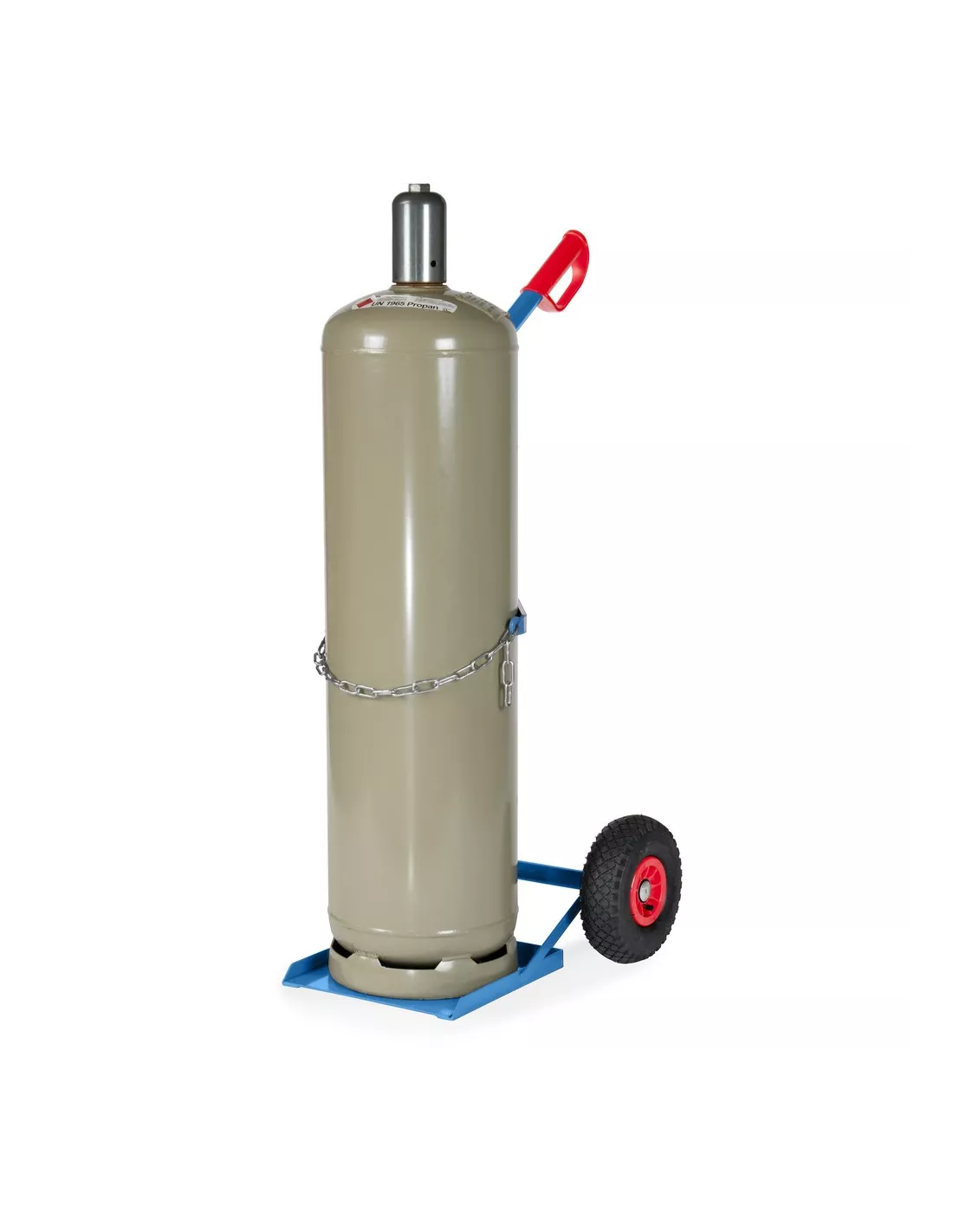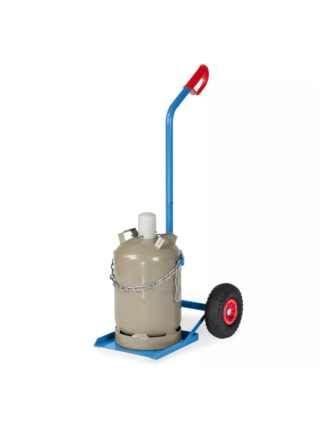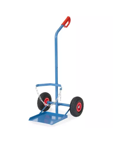 Tube d'acier soudé, revêtement époxy bleu RAL 5007. Diable porte-bouteilles avec chaîne de maintien. Vissable en deux hauteurs pour 1 bouteille de propane de 11 kg Ø 300 mm ou 33 kg Ø 318 mm. Roues gonflables, moyeu à roulement à rouleaux.