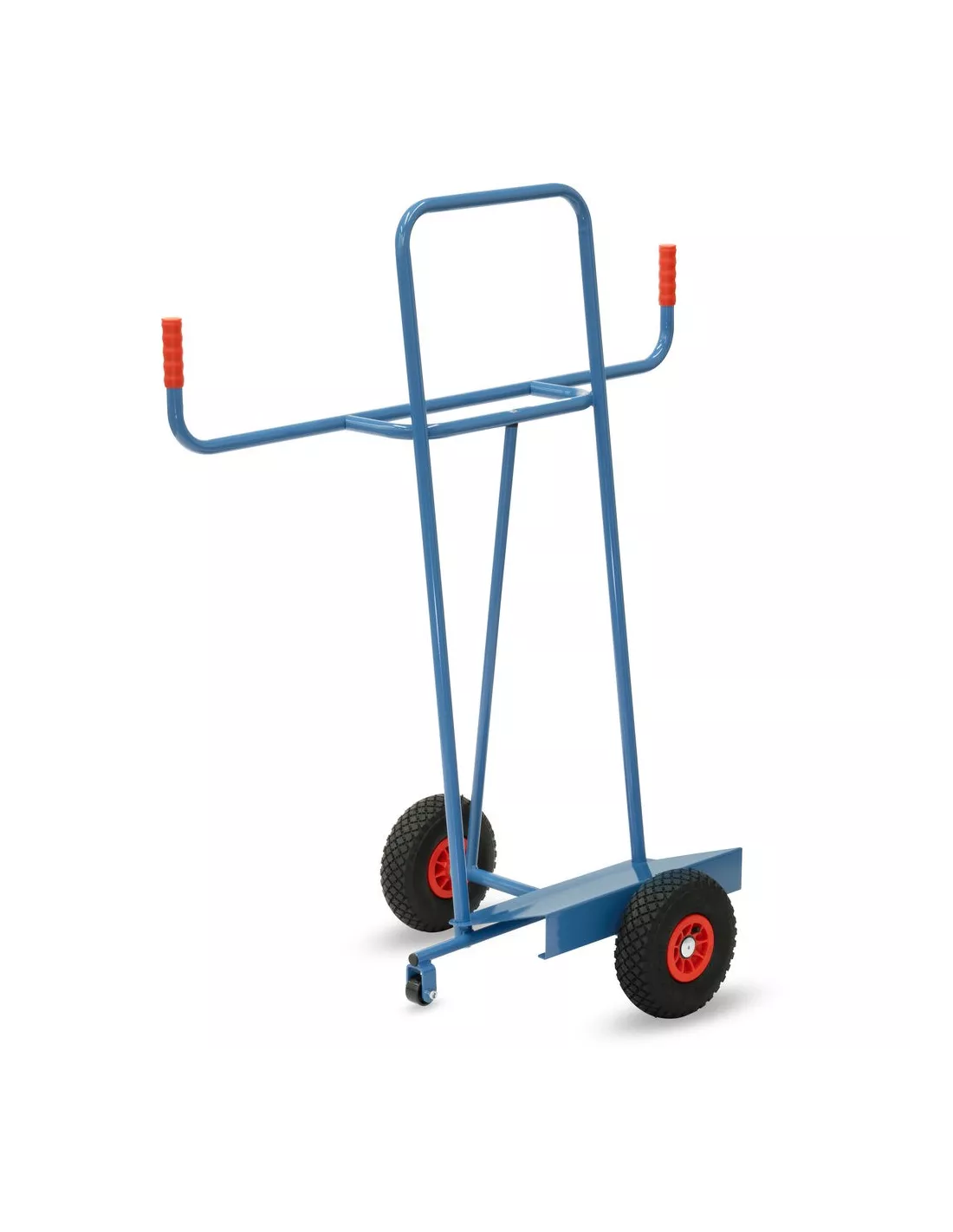 Construction en tube d'acier avec bavette en tôle d'acier, revêtement époxy bleu RAL 5007. Roues à bandage caoutchouc, moyeu à roulement à rouleaux. 2 galets de maintien Ø 50 mm. Pour le transport longitudinal de panneaux en bois et en plastique de grande surface.