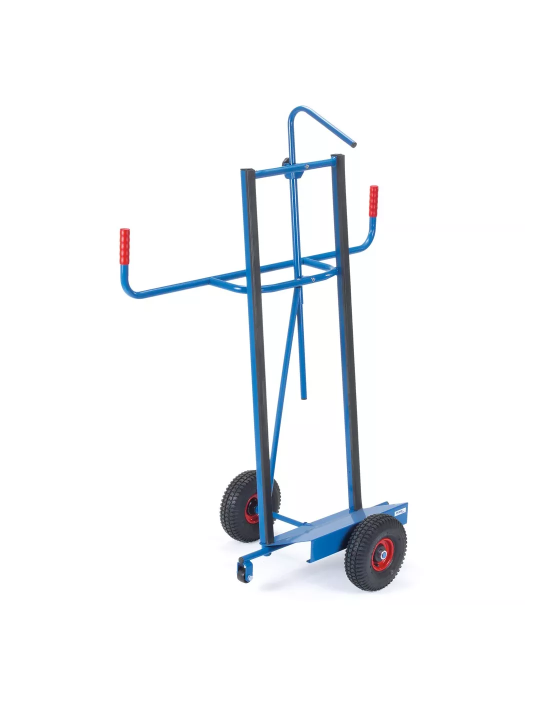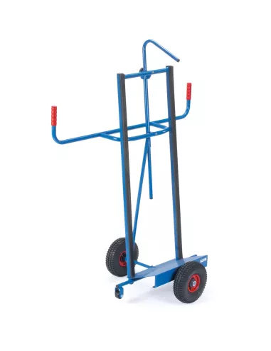 Construction en tube d'acier avec bavette tôle d'acier, protection antidérapante et système anti basculement des pièces, revêtement époxy bleu RAL 5007. Roues à bandage caoutchouc, moyeu à roulement à rouleaux. 2 galets de maintien Ø 50 mm. Pour le transport longitudinal de panneaux en bois et en plastique de grande surface.
