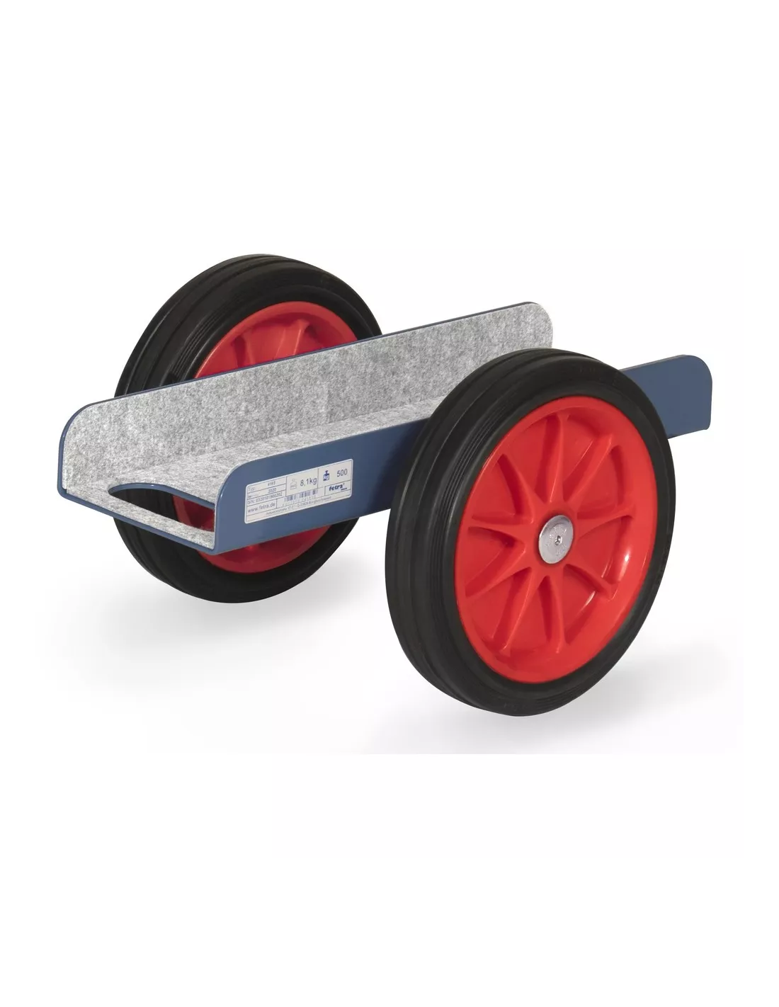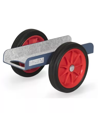 Construction en tôle d'acier, revêtement époxy bleu RAL 5007. Support en U recouvert de feutre de protection. Largeur support: 150 mm. Roues à bandage caoutchouc.