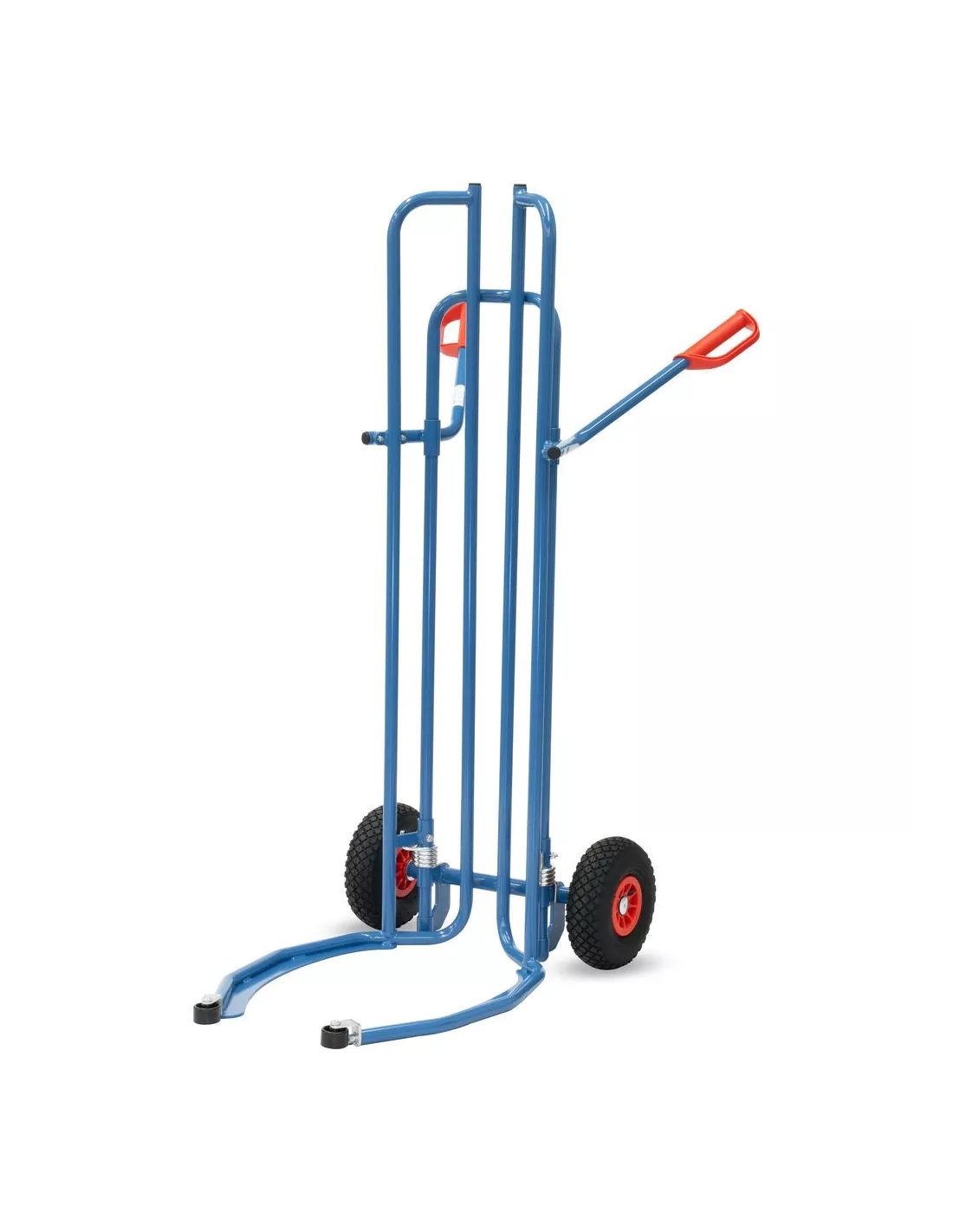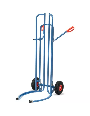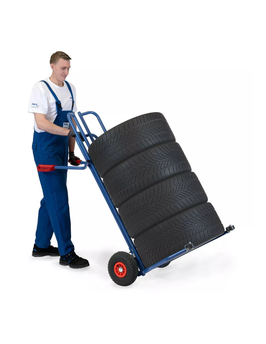 Construction en tube d'acier, revêtement époxy bleu RAL 5007. Spécialement conçu pour le transport de pneumatiques. Les fourches articulées en tube d'acier permettent d'embarquer jusqu'à 8 roues sans les empiler manuellement. Les rouleaux de démarrage à l'extrémité des fourches articulées soutiennent et facilitent le processus. Compatible pour Ø à partir de 450 à 860 mm. Adapté pour le transport de roues avec jantes. Roues gonflables, moyeu à roulement à rouleaux.
