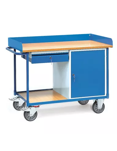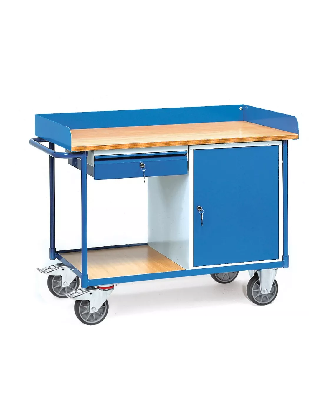 Construction en profilé et tube d'acier, revêtement époxy, caisson gris RAL 7035, armature et porte RAL 5007, plan de travail en contreplaqué de 22 mm avec rebord sur 3 côtés de 80 mm de haut, 1 placard verrouillable en tôle d'acier (HXLXP: 600 X 500 X 600 mm) avec porte, 1 plateau fixe et 2 amovibles, 1 placard tiroir (HXPXL: 105 X 415 X 490 mm) avec serrure cylindrique. Charge par plateau: 30 kg. 2 roues pivotantes et 2 roues fixes à bandage TPE, moyeu à roulement à billes central. Freins sur roues pivotantes.