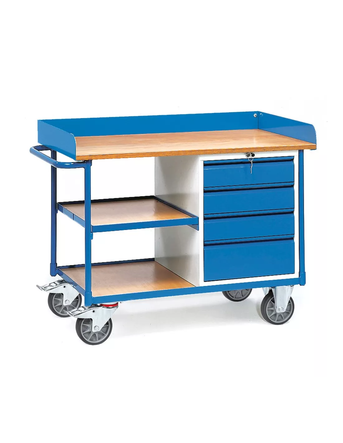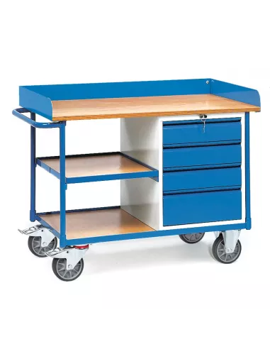 Construction en profilé et tube d'acier, revêtement époxy, caisson gris RAL 7035, armature et tiroirs RAL 5007, plan de travail en contreplaqué de 22 mm avec rebord sur 3 côtés de 80 mm de haut, 1 placard à 4 tiroirs avec serrure centrale (3 tiroirs de 120 mm de haut et 1 tiroir de 180 mm de haut). Charge par tiroir: 25 kg. 2 roues pivotantes et 2 roues fixes à bandage TPE, moyeu à roulement à billes central. Freins sur roues pivotantes.