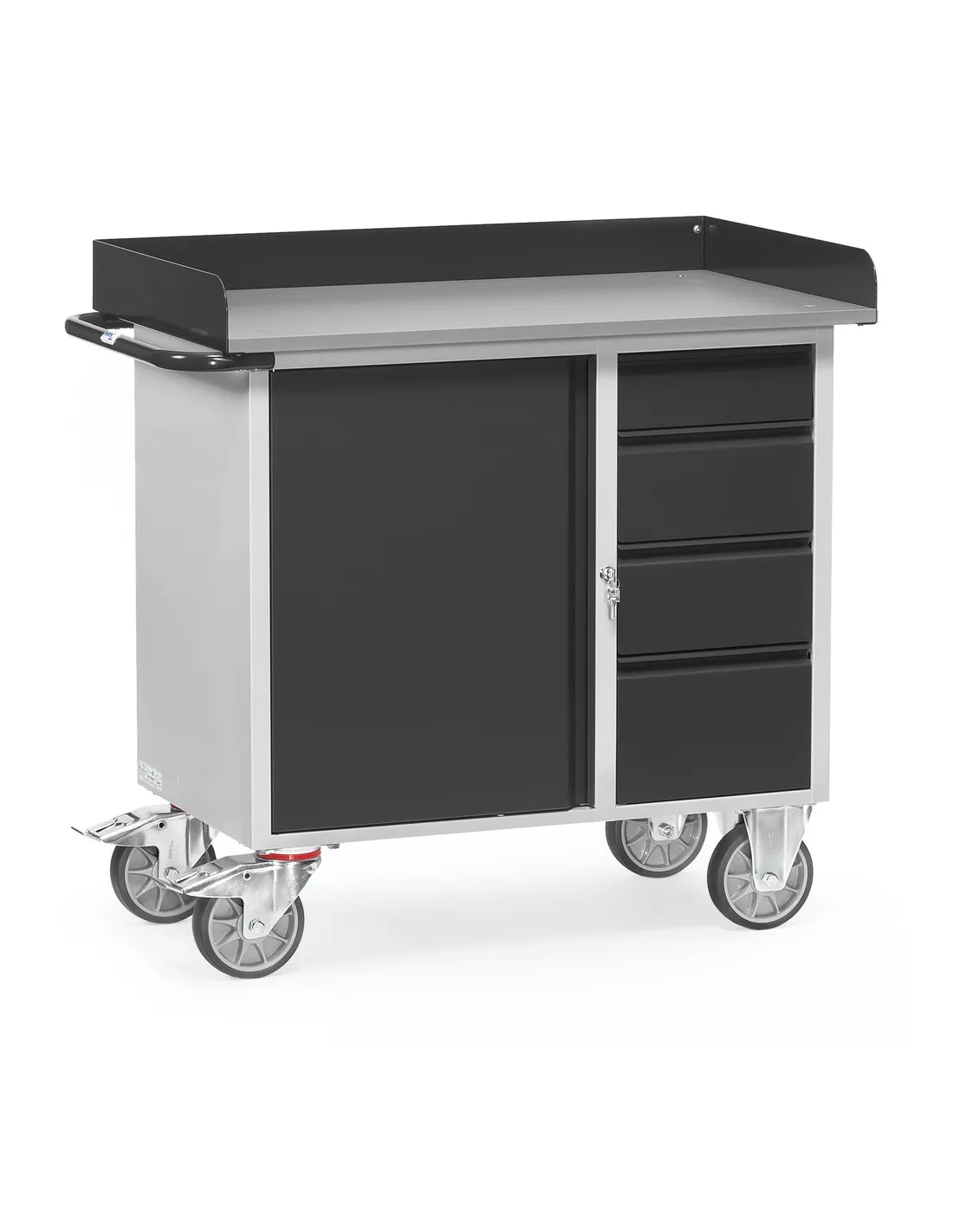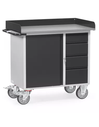 Construction en tôle d'acier, revêtement époxy, caisson gris RAL 7035, portes, rebords et poignée de poussée RAL 7016. 1 caisson placard avec 1 plateau de base fixe, 2 amovibles réglables et 4 tiroirs (HXLXP): 1 de 105 x 280 x 470 mm, 2 de 160 x 280 x 470 mm et 1 de 210 x 280 x 470 mm avec glissière et serrure centrale à cylindre. Plan de travail en mélaminé renforcé épaisseur 20 mm. Avec rebord en tôle d'acier sur 3 côtés, hauteur: 80 mm. 2 roues pivotantes et 2 roues fixes à bandage TPE, moyeu à roulement à billes central. Freins sur roues pivotantes. Livré démonté, montage facile.